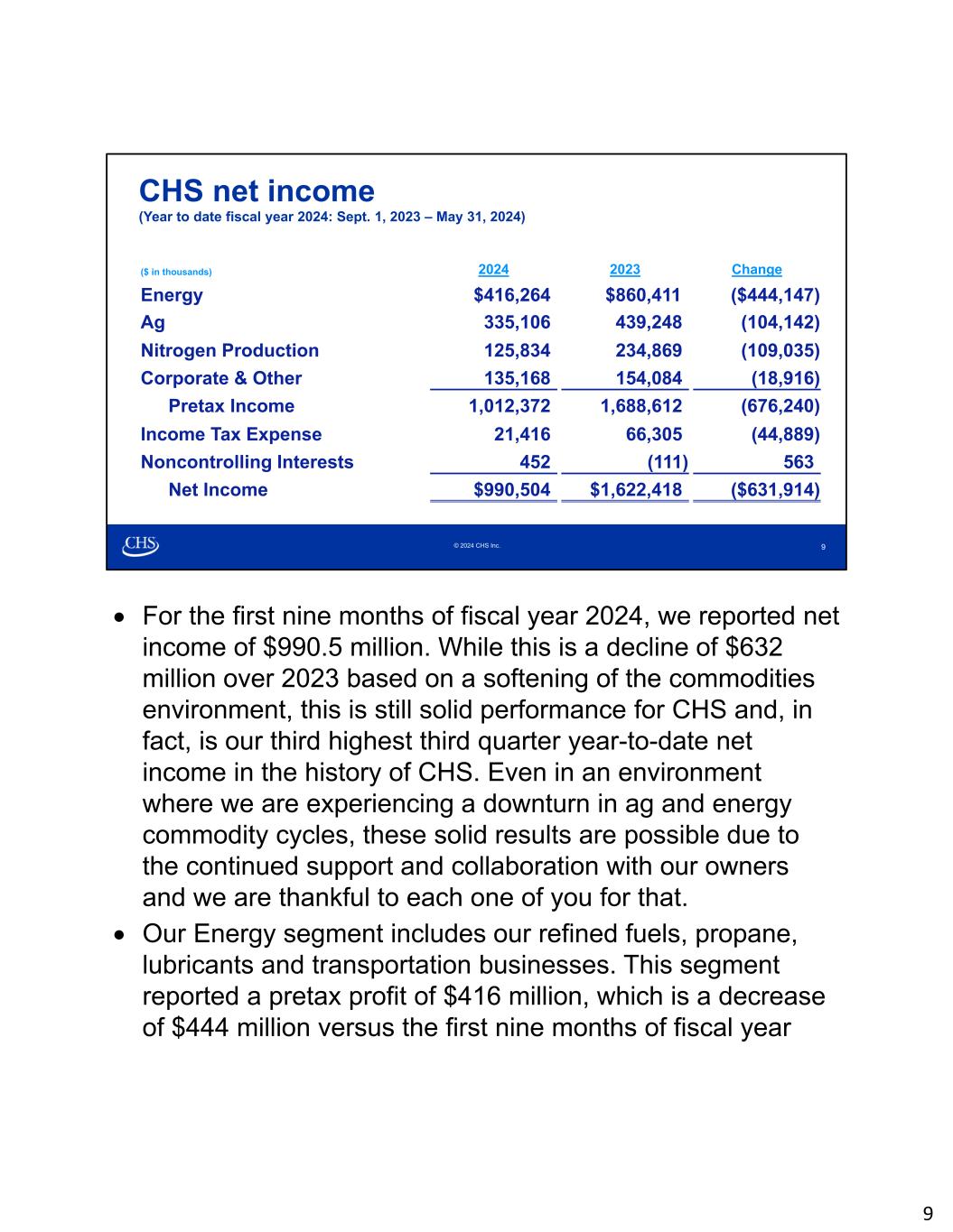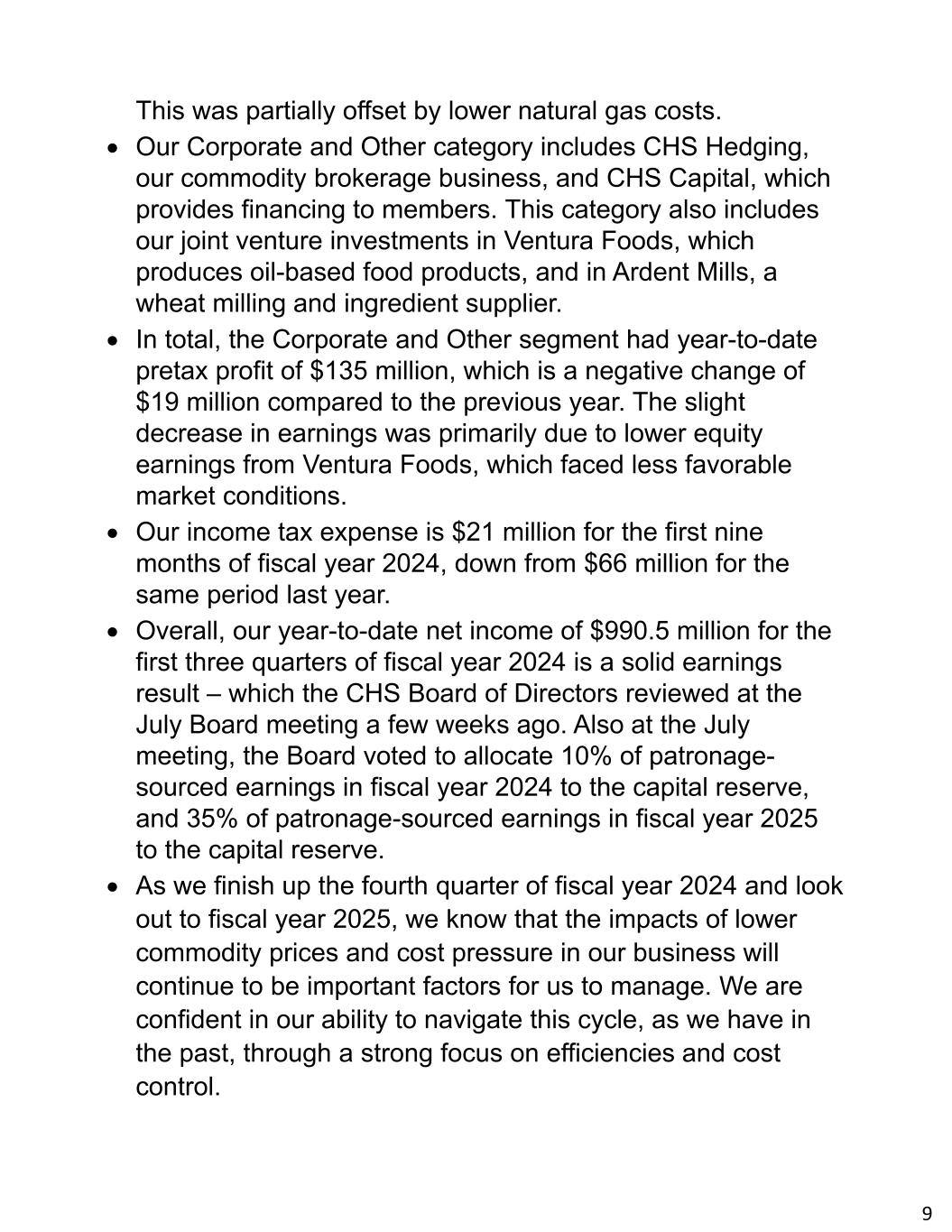This was partially offset by lower natural gas costs.  Our Corporate and Other category includes CHS Hedging, our commodity brokerage business, and CHS Capital, which provides financing to members. This category also includes our joint venture investments in Ventura Foods, which produces oil-based food products, and in Ardent Mills, a wheat milling and ingredient supplier.  In total, the Corporate and Other segment had year-to-date pretax profit of $135 million, which is a negative change of $19 million compared to the previous year. The slight decrease in earnings was primarily due to lower equity earnings from Ventura Foods, which faced less favorable market conditions.  Our income tax expense is $21 million for the first nine months of fiscal year 2024, down from $66 million for the same period last year.  Overall, our year-to-date net income of $990.5 million for the first three quarters of fiscal year 2024 is a solid earnings result – which the CHS Board of Directors reviewed at the July Board meeting a few weeks ago. Also at the July meeting, the Board voted to allocate 10% of patronage- sourced earnings in fiscal year 2024 to the capital reserve, and 35% of patronage-sourced earnings in fiscal year 2025 to the capital reserve.  As we finish up the fourth quarter of fiscal year 2024 and look out to fiscal year 2025, we know that the impacts of lower commodity prices and cost pressure in our business will continue to be important factors for us to manage. We are confident in our ability to navigate this cycle, as we have in the past, through a strong focus on efficiencies and cost control. 9