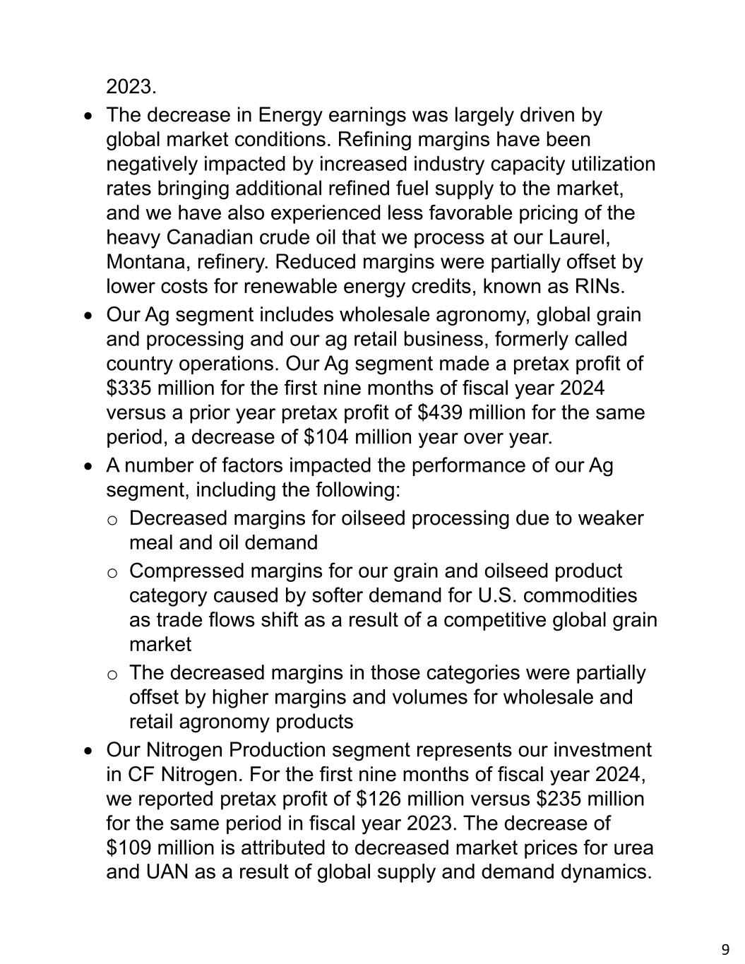 2023.  The decrease in Energy earnings was largely driven by global market conditions. Refining margins have been negatively impacted by increased industry capacity utilization rates bringing additional refined fuel supply to the market, and we have also experienced less favorable pricing of the heavy Canadian crude oil that we process at our Laurel, Montana, refinery. Reduced margins were partially offset by lower costs for renewable energy credits, known as RINs.  Our Ag segment includes wholesale agronomy, global grain and processing and our ag retail business, formerly called country operations. Our Ag segment made a pretax profit of $335 million for the first nine months of fiscal year 2024 versus a prior year pretax profit of $439 million for the same period, a decrease of $104 million year over year.  A number of factors impacted the performance of our Ag segment, including the following: o Decreased margins for oilseed processing due to weaker meal and oil demand o Compressed margins for our grain and oilseed product category caused by softer demand for U.S. commodities as trade flows shift as a result of a competitive global grain market o The decreased margins in those categories were partially offset by higher margins and volumes for wholesale and retail agronomy products  Our Nitrogen Production segment represents our investment in CF Nitrogen. For the first nine months of fiscal year 2024, we reported pretax profit of $126 million versus $235 million for the same period in fiscal year 2023. The decrease of $109 million is attributed to decreased market prices for urea and UAN as a result of global supply and demand dynamics. 9