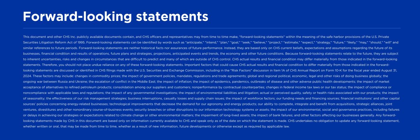 Forward-looking statements This document and other CHS Inc. publicly available documents contain, and CHS officers and representatives may from time to time make, "forward-looking statements" within the meaning of the safe harbor provisions of the U.S. Private Securities Litigation Reform Act of 1995. Forward-looking statements can be identified by words such as "anticipate," "intend," "plan," "goal," "seek," "believe," "project," "estimate," "expect," "strategy," "future," "likely," "may," "should," "will" and similar references to future periods. Forward-looking statements are neither historical facts nor assurances of future performance. Instead, they are based only on CHS current beliefs, expectations and assumptions regarding the future of its businesses, financial condition and results of operations, future plans and strategies, projections, anticipated events and trends, the economy and other future conditions. Because forward-looking statements relate to the future, they are subject to inherent uncertainties, risks and changes in circumstances that are difficult to predict and many of which are outside of CHS control. CHS actual results and financial condition may differ materially from those indicated in the forward-looking statements. Therefore, you should not place undue reliance on any of these forward-looking statements. Important factors that could cause CHS actual results and financial condition to differ materially from those indicated in the forward- looking statements are discussed or identified in CHS filings made with the U.S. Securities and Exchange Commission, including in the "Risk Factors" discussion in Item 1A of CHS Annual Report on Form 10-K for the fiscal year ended August 31, 2024. These factors may include: changes in commodity prices; the impact of government policies, mandates, regulations and trade agreements; global and regional political, economic, legal and other risks of doing business globally; the ongoing war between Russia and Ukraine; the escalation of conflict in the Middle East; the impact of inflation; the impact of epidemics, pandemics, outbreaks of disease and other adverse public health developments; the impact of market acceptance of alternatives to refined petroleum products; consolidation among our suppliers and customers; nonperformance by contractual counterparties; changes in federal income tax laws or our tax status; the impact of compliance or noncompliance with applicable laws and regulations; the impact of any governmental investigations; the impact of environmental liabilities and litigation; actual or perceived quality, safety or health risks associated with our products; the impact of seasonality; the effectiveness of our risk management strategies; business interruptions, casualty losses and supply chain issues; the impact of workforce factors; our funding needs and financing sources; financial institutions’ and other capital sources’ policies concerning energy-related businesses; technological improvements that decrease the demand for our agronomy and energy products; our ability to complete, integrate and benefit from acquisitions, strategic alliances, joint ventures, divestitures and other nonordinary course-of-business events; security breaches or other disruptions to our information technology systems or assets; the impact of our environmental, social and governance practices, including failures or delays in achieving our strategies or expectations related to climate change or other environmental matters; the impairment of long-lived assets; the impact of bank failures; and other factors affecting our businesses generally. Any forward- looking statements made by CHS in this document are based only on information currently available to CHS and speak only as of the date on which the statement is made. CHS undertakes no obligation to update any forward-looking statement, whether written or oral, that may be made from time to time, whether as a result of new information, future developments or otherwise except as required by applicable law.