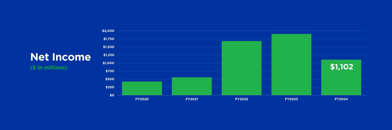 $0 $250 $500 $750 $1,000 $1,250 $1,500 $1,750 $2,000 FY2020 FY2021 FY2022 FY2023 FY2024 $1,102 Net Income ($ in millions)