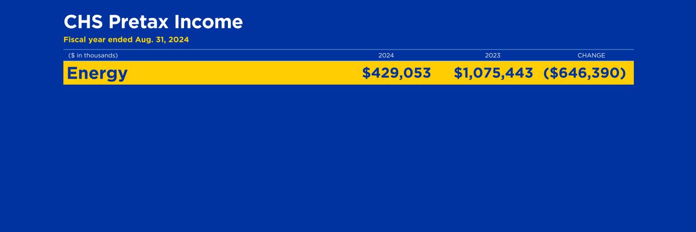 CHS Pretax Income Fiscal year ended Aug. 31, 2024 ($ in thousands) 2024 2023 CHANGE Energy $429,053 $1,075,443 ($646,390)