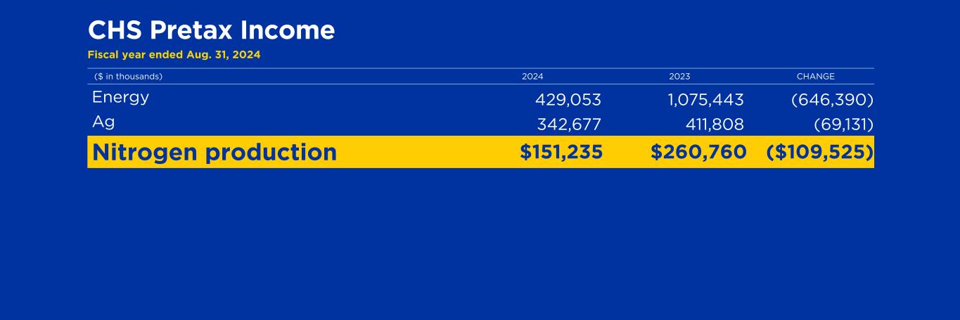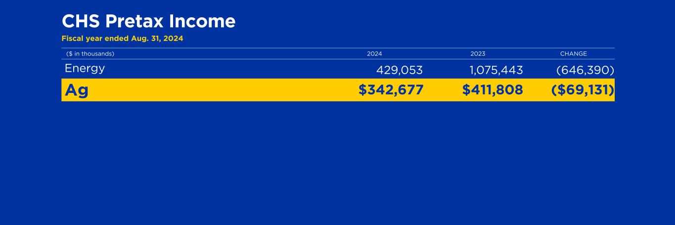 CHS Pretax Income Fiscal year ended Aug. 31, 2024 ($ in thousands) 2024 2023 CHANGE Energy 429,053 1,075,443 (646,390) Ag 342,677 411,808 (69,131) Nitrogen production 151,235 260,760 (109,525) Corporate and other $174,822 $259,768 ($84,946)