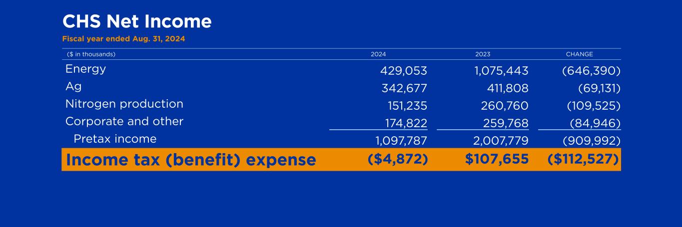 ($ in thousands) 2024 2023 CHANGE Energy 429,053 1,075,443 (646,390) Ag 342,677 411,808 (69,131) Nitrogen production 151,235 260,760 (109,525) Corporate and other 174,822 259,768 (84,946) Pretax income 1,097,787 2,007,779 (909,992) CHS Net Income Fiscal year ended Aug. 31, 2024 Income tax (benefit) expense ($4,872) $107,655 ($112,527)