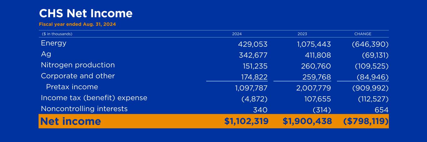 ($ in thousands) 2024 2023 CHANGE Energy 429,053 1,075,443 (646,390) Ag 342,677 411,808 (69,131) Nitrogen production 151,235 260,760 (109,525) Corporate and other 174,822 259,768 (84,946) Pretax income 1,097,787 2,007,779 (909,992) Income tax (benefit) expense (4,872) 107,655 (112,527) Noncontrolling interests 340 (314) 654 CHS Net Income Fiscal year ended Aug. 31, 2024 Net income $1,102,319 $1,900,438 ($798,119)