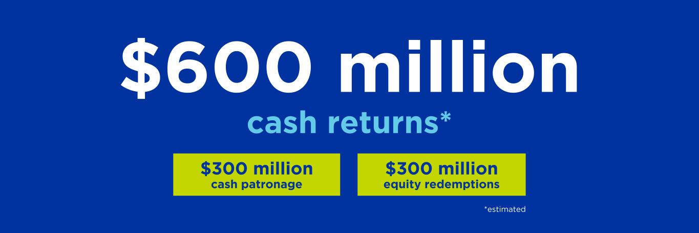 cash returns* $300 million cash patronage $300 million equity redemptions *estimated