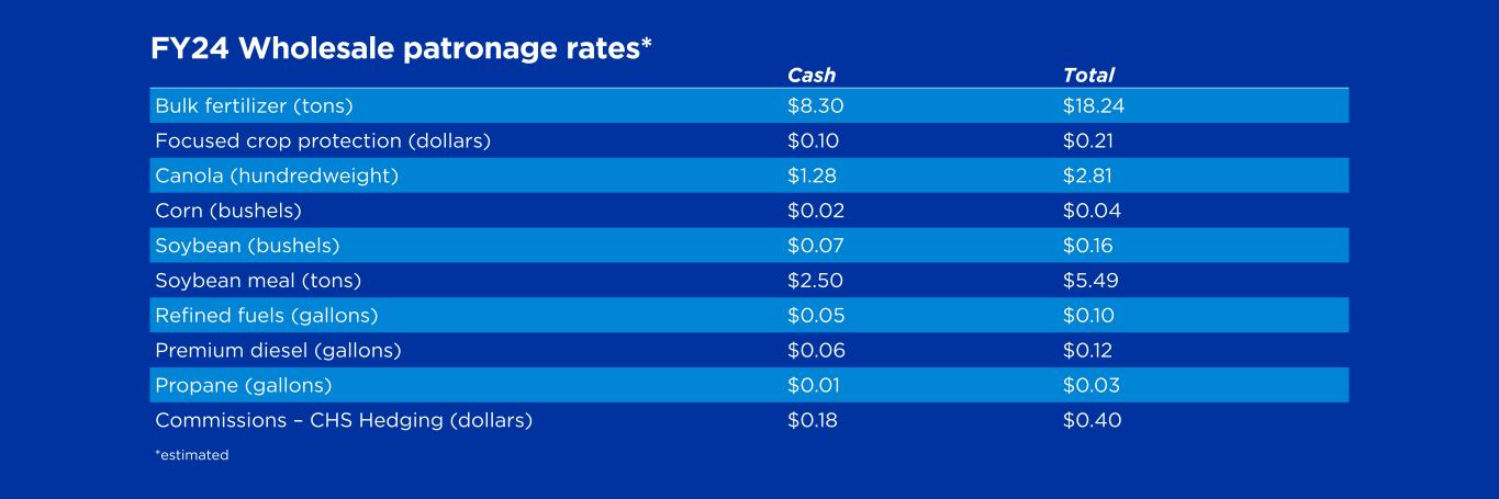 Cash Total Bulk fertilizer (tons) $8.30 $18.24 Focused crop protection (dollars) $0.10 $0.21 Canola (hundredweight) $1.28 $2.81 Corn (bushels) $0.02 $0.04 Soybean (bushels) $0.07 $0.16 Soybean meal (tons) $2.50 $5.49 Refined fuels (gallons) $0.05 $0.10 Premium diesel (gallons) $0.06 $0.12 Propane (gallons) $0.01 $0.03 Commissions – CHS Hedging (dollars) $0.18 $0.40 *estimated FY24 Wholesale patronage rates*