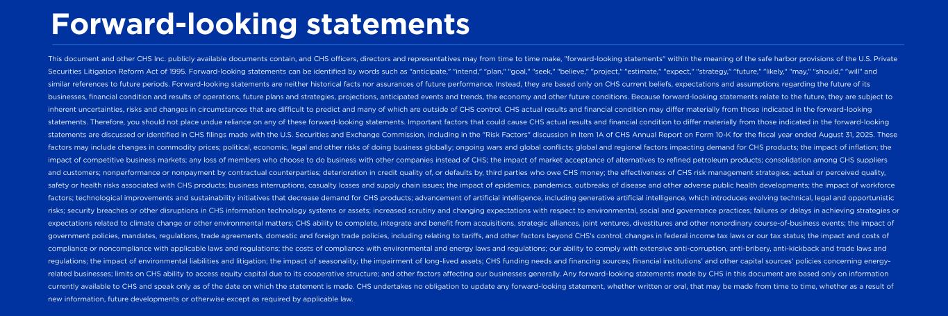 Forward-looking statements This document and other CHS Inc. publicly available documents contain, and CHS officers, directors and representatives may from time to time make, "forward-looking statements" within the meaning of the safe harbor provisions of the U.S. Private Securities Litigation Reform Act of 1995. Forward-looking statements can be identified by words such as "anticipate," "intend," "plan," "goal," "seek," "believe," "project," "estimate," "expect," "strategy," "future," "likely," "may," "should," "will" and similar references to future periods. Forward-looking statements are neither historical facts nor assurances of future performance. Instead, they are based only on CHS current beliefs, expectations and assumptions regarding the future of its businesses, financial condition and results of operations, future plans and strategies, projections, anticipated events and trends, the economy and other future conditions. Because forward-looking statements relate to the future, they are subject to inherent uncertainties, risks and changes in circumstances that are difficult to predict and many of which are outside of CHS control. CHS actual results and financial condition may differ materially from those indicated in the forward-looking statements. Therefore, you should not place undue reliance on any of these forward-looking statements. Important factors that could cause CHS actual results and financial condition to differ materially from those indicated in the forward-looking statements are discussed or identified in CHS filings made with the U.S. Securities and Exchange Commission, including in the "Risk Factors" discussion in Item 1A of CHS Annual Report on Form 10-K for the fiscal year ended August 31, 2025. These factors may include changes in commodity prices; political, economic, legal and other risks of doing business globally; ongoing wars and global conflicts; global and regional factors impacting demand for CHS products; the impact of inflation; the impact of competitive business markets; any loss of members who choose to do business with other companies instead of CHS; the impact of market acceptance of alternatives to refined petroleum products; consolidation among CHS suppliers and customers; nonperformance or nonpayment by contractual counterparties; deterioration in credit quality of, or defaults by, third parties who owe CHS money; the effectiveness of CHS risk management strategies; actual or perceived quality, safety or health risks associated with CHS products; business interruptions, casualty losses and supply chain issues; the impact of epidemics, pandemics, outbreaks of disease and other adverse public health developments; the impact of workforce factors; technological improvements and sustainability initiatives that decrease demand for CHS products; advancement of artificial intelligence, including generative artificial intelligence, which introduces evolving technical, legal and opportunistic risks; security breaches or other disruptions in CHS information technology systems or assets; increased scrutiny and changing expectations with respect to environmental, social and governance practices; failures or delays in achieving strategies or expectations related to climate change or other environmental matters; CHS ability to complete, integrate and benefit from acquisitions, strategic alliances, joint ventures, divestitures and other nonordinary course-of-business events; the impact of government policies, mandates, regulations, trade agreements, domestic and foreign trade policies, including relating to tariffs, and other factors beyond CHS’s control; changes in federal income tax laws or our tax status; the impact and costs of compliance or noncompliance with applicable laws and regulations; the costs of compliance with environmental and energy laws and regulations; our ability to comply with extensive anti-corruption, anti-bribery, anti-kickback and trade laws and regulations; the impact of environmental liabilities and litigation; the impact of seasonality; the impairment of long-lived assets; CHS funding needs and financing sources; financial institutions’ and other capital sources’ policies concerning energy- related businesses; limits on CHS ability to access equity capital due to its cooperative structure; and other factors affecting our businesses generally. Any forward-looking statements made by CHS in this document are based only on information currently available to CHS and speak only as of the date on which the statement is made. CHS undertakes no obligation to update any forward-looking statement, whether written or oral, that may be made from time to time, whether as a result of new information, future developments or otherwise except as required by applicable law.