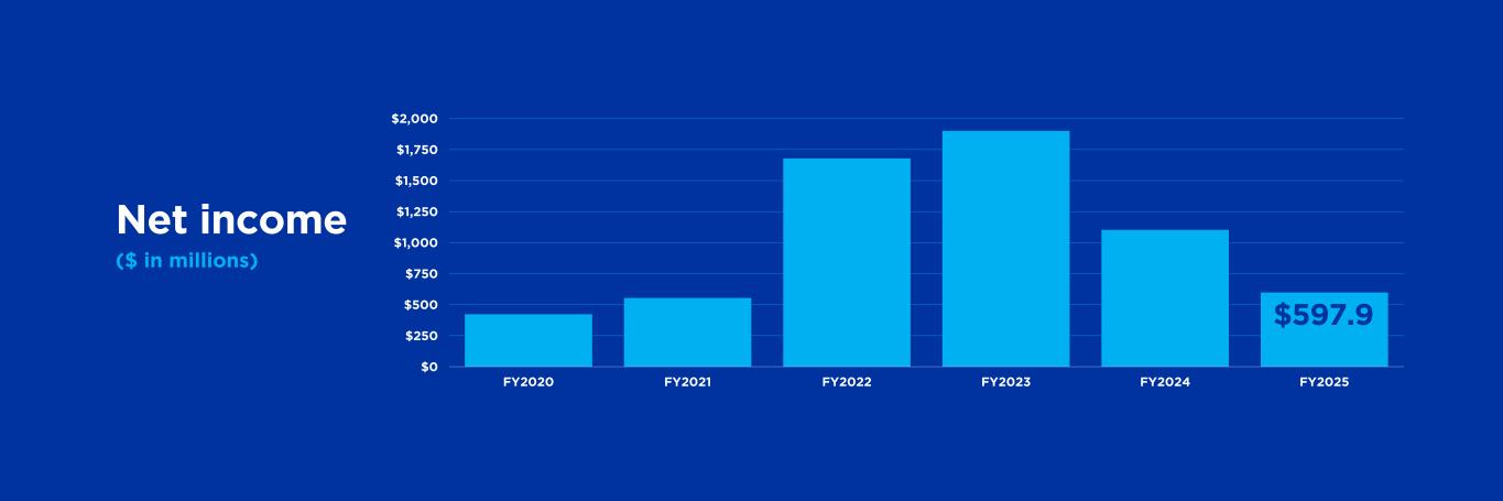 $0 $250 $500 $750 $1,000 $1,250 $1,500 $1,750 $2,000 FY2020 FY2021 FY2022 FY2023 FY2024 FY2025 $597.9 Net income ($ in millions)