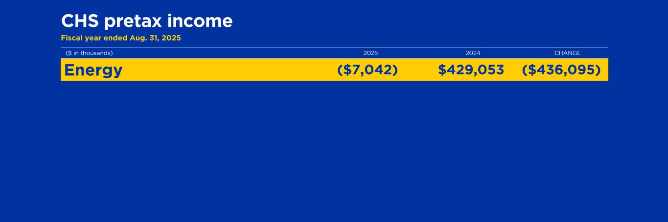CHS pretax income Fiscal year ended Aug. 31, 2025 ($ in thousands) 2025 2024 CHANGE Energy (7,042) 429,053 (436,095) Ag $245,660 $342,677 ($97,017)