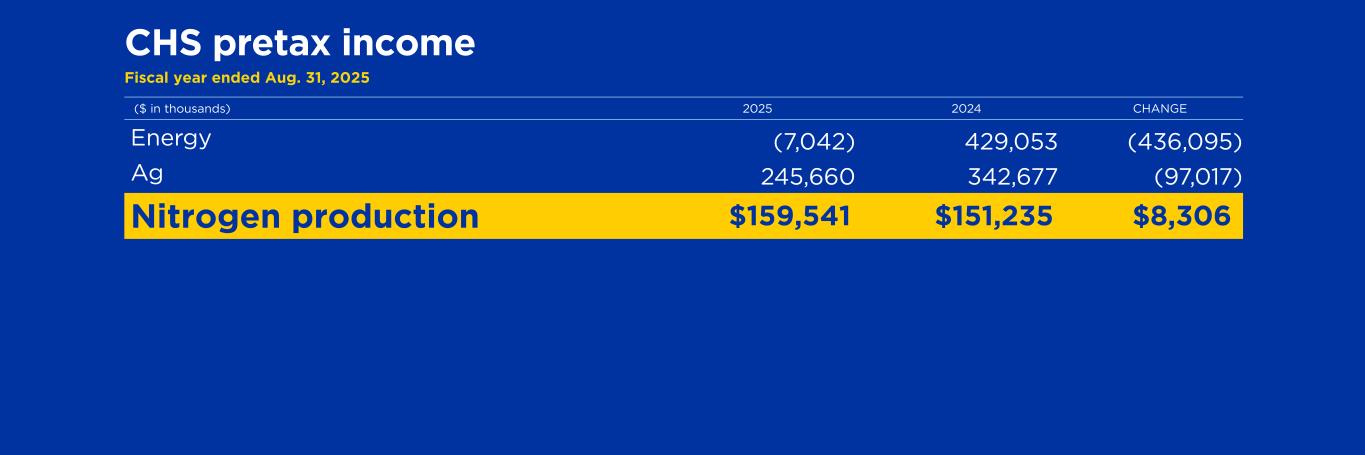 CHS pretax income Fiscal year ended Aug. 31, 2025 ($ in thousands) 2025 2024 CHANGE Energy (7,042) 429,053 (436,095) Ag 245,660 342,677 (97,017) Nitrogen production $159,541 $151,235 $8,306