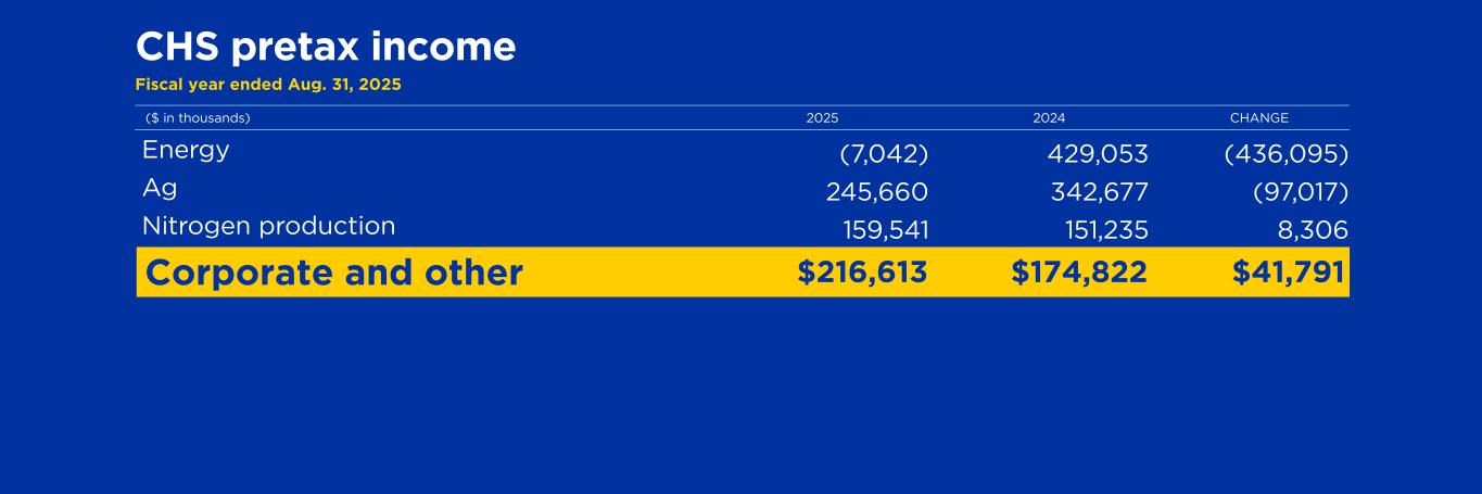 CHS pretax income Fiscal year ended Aug. 31, 2025 ($ in thousands) 2025 2024 CHANGE Energy (7,042) 429,053 (436,095) Ag 245,660 342,677 (97,017) Nitrogen production 159,541 151,235 8,306 Corporate and other $216,613 $174,822 $41,791
