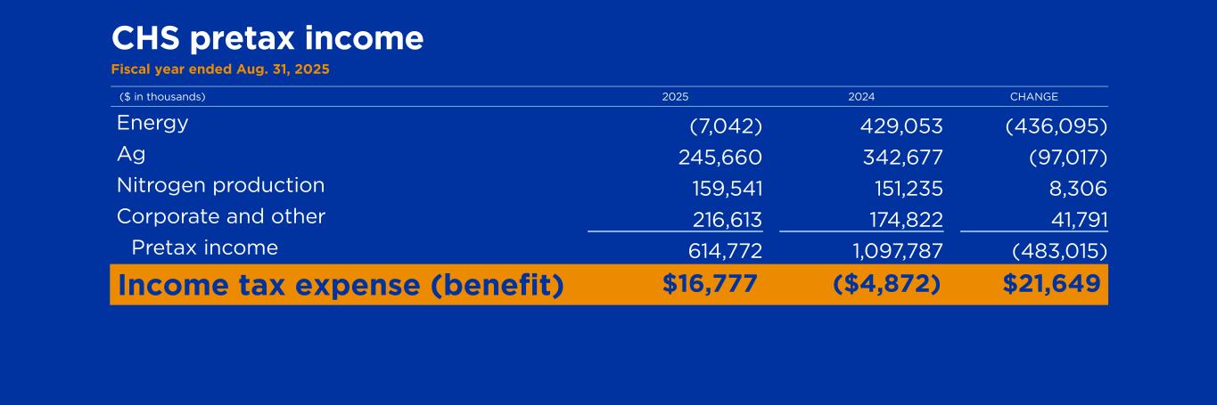 ($ in thousands) 2025 2024 CHANGE Energy (7,042) 429,053 (436,095) Ag 245,660 342,677 (97,017) Nitrogen production 159,541 151,235 8,306 Corporate and other 216,613 174,822 41,791 Pretax income 614,772 1,097,787 (483,015) CHS pretax income Fiscal year ended Aug. 31, 2025 Income tax expense (benefit) $16,777 ($4,872) $21,649