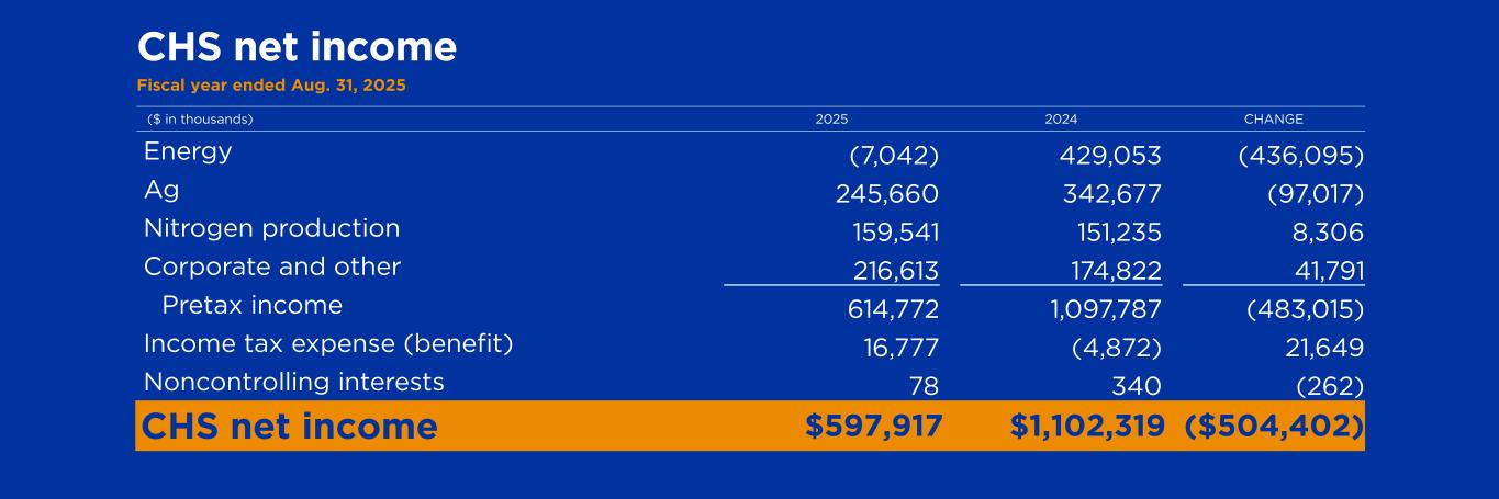($ in thousands) 2025 2024 CHANGE Energy (7,042) 429,053 (436,095) Ag 245,660 342,677 (97,017) Nitrogen production 159,541 151,235 8,306 Corporate and other 216,613 174,822 41,791 Pretax income 614,772 1,097,787 (483,015) Income tax expense (benefit) 16,777 (4,872) 21,649 Noncontrolling interests 78 340 (262) CHS net income Fiscal year ended Aug. 31, 2025 CHS net income $597,917 $1,102,319 ($504,402)