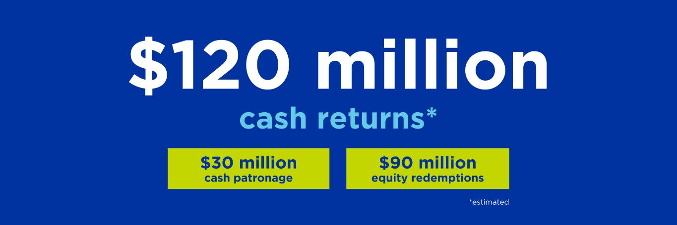 cash returns* $30 million cash patronage $90 million equity redemptions *estimated