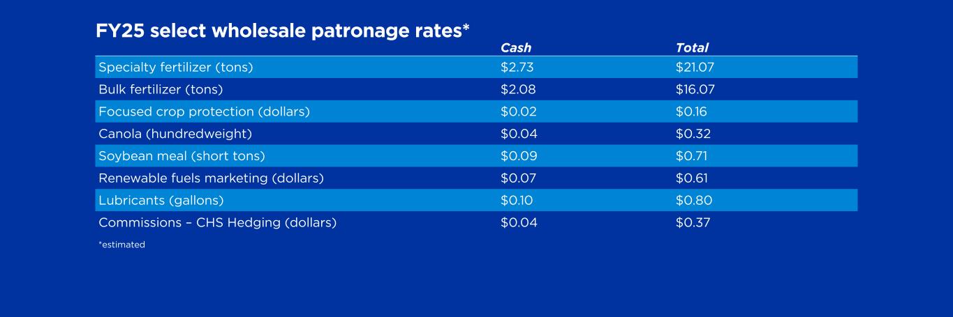 Cash Total Specialty fertilizer (tons) $2.73 $21.07 Bulk fertilizer (tons) $2.08 $16.07 Focused crop protection (dollars) $0.02 $0.16 Canola (hundredweight) $0.04 $0.32 Soybean meal (short tons) $0.09 $0.71 Renewable fuels marketing (dollars) $0.07 $0.61 Lubricants (gallons) $0.10 $0.80 Commissions – CHS Hedging (dollars) $0.04 $0.37 *estimated FY25 select wholesale patronage rates*