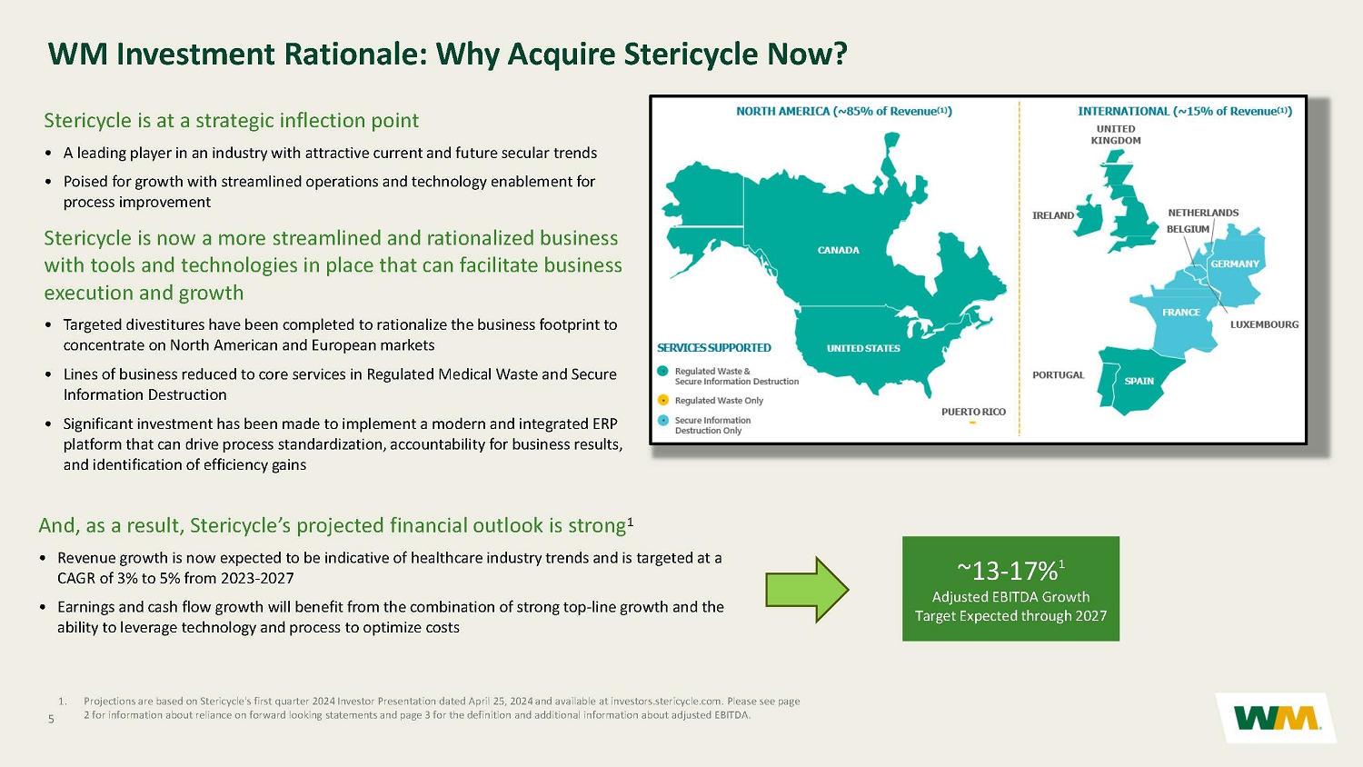 CONFIDENTIAL AND PROPRIETARY INFORMATION OF WM CONFIDENTIAL AND PROPRIETARY INFORMATION OF WM WM’s Strategic Rationale for its Planned Acquisition of Stericycle • With an aging population and broader healthcare trends, the medical waste sector is expected to experience structural volume growth that could outpace the factors that drive traditional solid waste volume trends (population growth and GDP) • Stericycle has a leading medical waste disposal and transfer network and long - standing customer relationships, positioning it as a clear market leader in the medical waste and compliance business in North America Stericycle is a leading player in a growing market segment supported by attractive secular trends • The planned acquisition will position WM to offer customers an increasingly comprehensive suite of services as the leading environmental solutions provider in North America • Stericycle’s business functions include waste collection, management, and disposal, all of which are well - aligned with WM’s core business and capabilities • Stericycle builds on WM’s sustainability commitments with leading, comprehensive service offerings focused on promoting healthy and safe communities Complementary business platforms extend WM’s suite of comprehensive waste and environmental solutions WM’s ability to leverage technology to both grow customer lifetime value and to enable an optimized cost - to - serve are expected to accelerate earnings growth of this business • Attractive post - synergy transaction multiple compared to WM's current trading multiple • Expected low double - digit IRR that provides a healthy premium to WM’s cost of capital • >$125 million of projected annual run - rate cost synergies expected from WM’s keen focus on optimizing SG&A costs, its expertise in logistics and technology - enabled operating cost optimization, and the ability to internalize disposal volumes into WM’s leading waste disposal network Projected synergies and the expected growth profile of medical waste make this a financially attractive transaction 4 • WM’s data - driven approach to understand customers’ needs is expected to identify opportunities for additional profitable volume growth through strong customer relationships • WM expects additional upside potential from cross - selling opportunities to non - overlapping customers • WM has a proven track - record of providing customers with valuable data and insights about their waste streams and we expect to leverage this expertise to provide additional value to customers in the healthcare sector • WM’s expertise in using technology to enable process optimization and continuous improvement is expected to support Stericycle’s ERP adoption, which is key to the execution of its Long - Range Plan