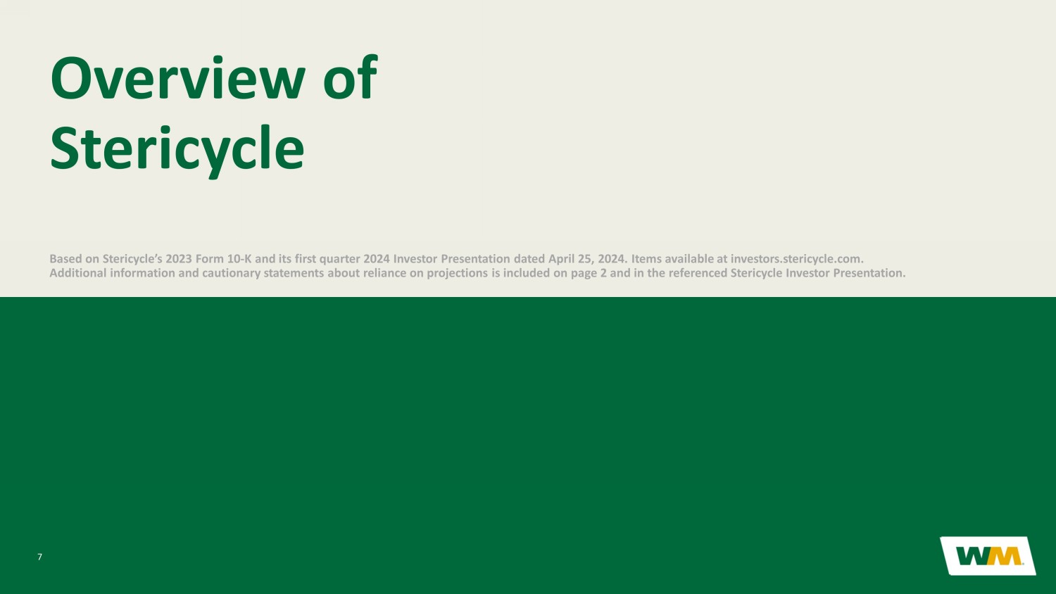 CONFIDENTIAL AND PROPRIETARY INFORMATION OF WM 7 Overview of Stericycle Based on Stericycle’s 2023 Form 10 - K and its first quarter 2024 Investor Presentation dated April 25, 2024. Items available at i nvestors.stericycle.com. Additional information and cautionary statements about reliance on projections is included on page 2 and in the referenced St eri cycle Investor Presentation.