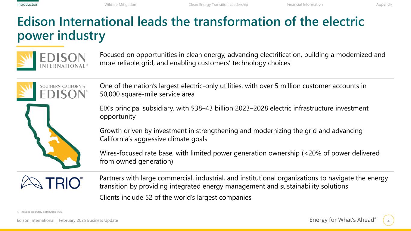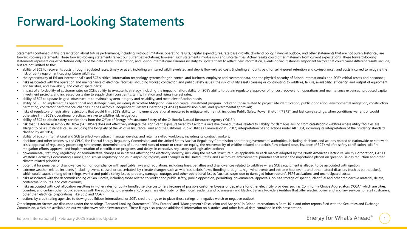 1Edison International | February 2025 Business Update Statements contained in this presentation about future performance, including, without limitation, operating results, capital expenditures, rate base growth, dividend policy, financial outlook, and other statements that are not purely historical, are forward-looking statements. These forward-looking statements reflect our current expectations; however, such statements involve risks and uncertainties. Actual results could differ materially from current expectations. These forward-looking statements represent our expectations only as of the date of this presentation, and Edison International assumes no duty to update them to reflect new information, events or circumstances. Important factors that could cause different results include, but are not limited to the: • ability of SCE to recover its costs through regulated rates, timely or at all, including uninsured wildfire-related and debris flow-related costs (including amounts paid for self-insured retention and co-insurance), and costs incurred to mitigate the risk of utility equipment causing future wildfires; • the cybersecurity of Edison International's and SCE's critical information technology systems for grid control and business, employee and customer data, and the physical security of Edison International's and SCE's critical assets and personnel; • risks associated with the operation and maintenance of electrical facilities, including worker, contractor, and public safety issues, the risk of utility assets causing or contributing to wildfires, failure, availability, efficiency, and output of equipment and facilities, and availability and cost of spare parts; • impact of affordability of customer rates on SCE's ability to execute its strategy, including the impact of affordability on SCE’s ability to obtain regulatory approval of, or cost recovery for, operations and maintenance expenses, proposed capital investment projects, and increased costs due to supply chain constraints, tariffs, inflation and rising interest rates; • ability of SCE to update its grid infrastructure to maintain system integrity and reliability, and meet electrification needs; • ability of SCE to implement its operational and strategic plans, including its Wildfire Mitigation Plan and capital investment program, including those related to project site identification, public opposition, environmental mitigation, construction, permitting, contractor performance, changes in the California Independent System Operator's (“CAISO”) transmission plans, and governmental approvals; • risks of regulatory or legislative restrictions that would limit SCE's ability to implement operational measures to mitigate wildfire risk, including Public Safety Power Shutoff (“PSPS”) and fast curve settings, when conditions warrant or would otherwise limit SCE's operational practices relative to wildfire risk mitigation; • ability of SCE to obtain safety certifications from the Office of Energy Infrastructure Safety of the California Natural Resources Agency (“OEIS“); • risk that California Assembly Bill 1054 (“AB 1054“) does not effectively mitigate the significant exposure faced by California investor-owned utilities related to liability for damages arising from catastrophic wildfires where utility facilities are alleged to be a substantial cause, including the longevity of the Wildfire Insurance Fund and the California Public Utilities Commission (“CPUC”) interpretation of and actions under AB 1054, including its interpretation of the prudency standard clarified by AB 1054; • ability of Edison International and SCE to effectively attract, manage, develop and retain a skilled workforce, including its contract workers; • decisions and other actions by the CPUC, the Federal Energy Regulatory Commission, and the United States Nuclear Regulatory Commission and other governmental authorities, including decisions and actions related to nationwide or statewide crisis, approval of regulatory proceeding settlements, determinations of authorized rates of return or return on equity, the recoverability of wildfire-related and debris flow-related costs, issuance of SCE's wildfire safety certification, wildfire mitigation efforts, approval and implementation of electrification programs, and delays in executive, regulatory and legislative actions; • governmental, statutory, regulatory, or administrative changes or initiatives affecting the electricity industry, including the market structure rules applicable to each market adopted by the North American Electric Reliability Corporation, CAISO, Western Electricity Coordinating Council, and similar regulatory bodies in adjoining regions, and changes in the United States' and California's environmental priorities that lessen the importance placed on greenhouse gas reduction and other climate related priorities; • potential for penalties or disallowances for non-compliance with applicable laws and regulations, including fines, penalties and disallowances related to wildfires where SCE's equipment is alleged to be associated with ignition; • extreme weather-related incidents (including events caused, or exacerbated, by climate change), such as wildfires, debris flows, flooding, droughts, high wind events and extreme heat events and other natural disasters (such as earthquakes), which could cause, among other things, worker and public safety issues, property damage, outages and other operational issues (such as issues due to damaged infrastructure), PSPS activations and unanticipated costs; • risks associated with the decommissioning of San Onofre, including those related to worker and public safety, public opposition, permitting, governmental approvals, on-site storage of spent nuclear fuel and other radioactive material, delays, contractual disputes, and cost overruns; • risks associated with cost allocation resulting in higher rates for utility bu