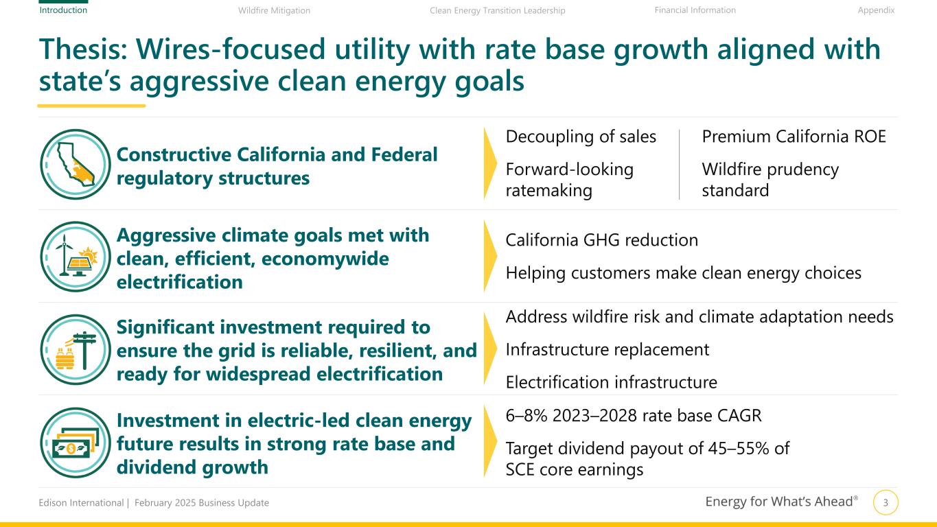 2Edison International | February 2025 Business Update Clean Energy Transition LeadershipWildfire Mitigation Financial Information AppendixIntroduction Edison International leads the transformation of the electric power industry One of the nation’s largest electric-only utilities, with over 5 million customer accounts in 50,000 square-mile service area EIX’s principal subsidiary, with $38–43 billion 2023–2028 electric infrastructure investment opportunity Growth driven by investment in strengthening and modernizing the grid and advancing California’s aggressive climate goals Wires-focused rate base, with limited power generation ownership (<20% of power delivered from owned generation) Partners with large commercial, industrial, and institutional organizations to navigate the energy transition by providing integrated energy management and sustainability solutions Clients include 52 of the world’s largest companies Focused on opportunities in clean energy, advancing electrification, building a modernized and more reliable grid, and enabling customers’ technology choices 1. Includes secondary distribution lines