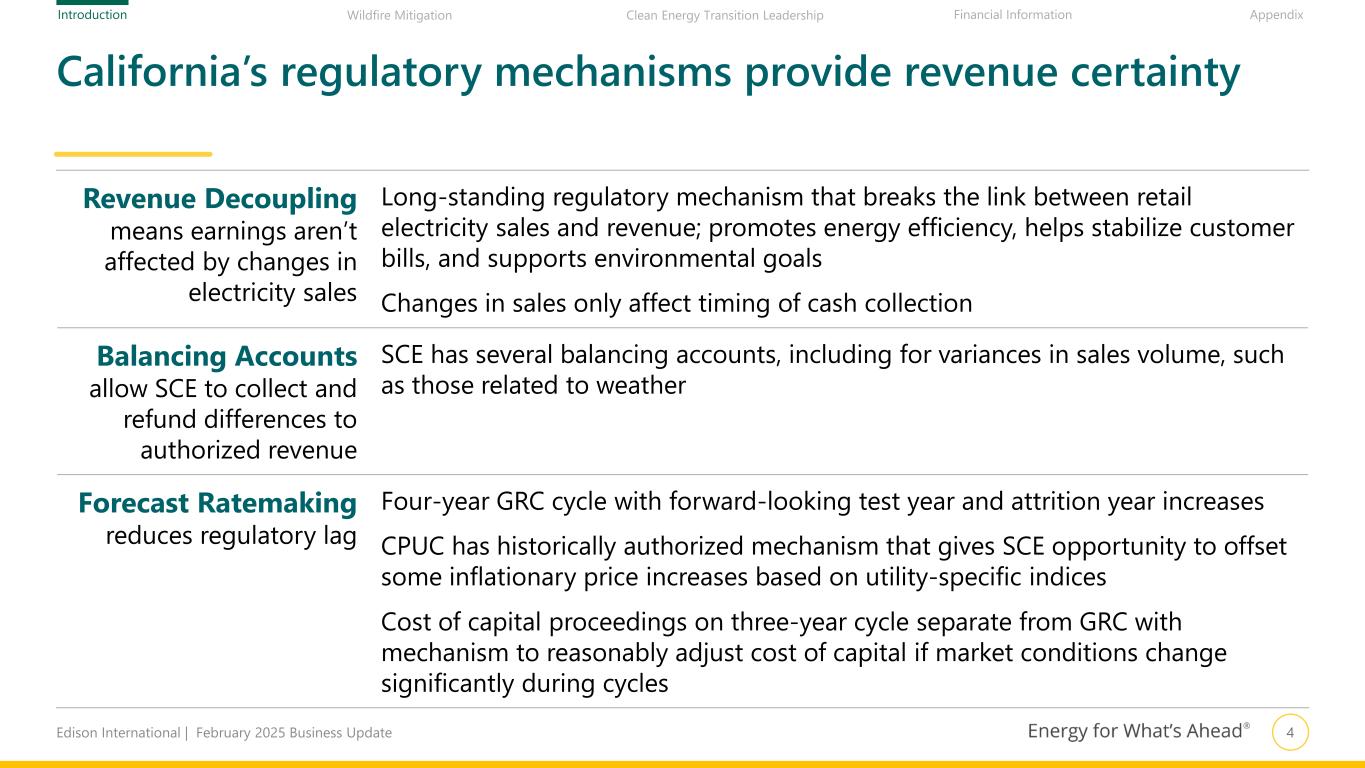 4Edison International | February 2025 Business Update Clean Energy Transition LeadershipWildfire Mitigation Financial Information AppendixIntroduction California’s regulatory mechanisms provide revenue certainty Revenue Decoupling means earnings aren’t affected by changes in electricity sales Long-standing regulatory mechanism that breaks the link between retail electricity sales and revenue; promotes energy efficiency, helps stabilize customer bills, and supports environmental goals Changes in sales only affect timing of cash collection Balancing Accounts allow SCE to collect and refund differences to authorized revenue SCE has several balancing accounts, including for variances in sales volume, such as those related to weather Forecast Ratemaking reduces regulatory lag Four-year GRC cycle with forward-looking test year and attrition year increases CPUC has historically authorized mechanism that gives SCE opportunity to offset some inflationary price increases based on utility-specific indices Cost of capital proceedings on three-year cycle separate from GRC with mechanism to reasonably adjust cost of capital if market conditions change significantly during cycles
