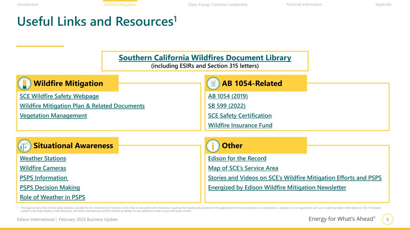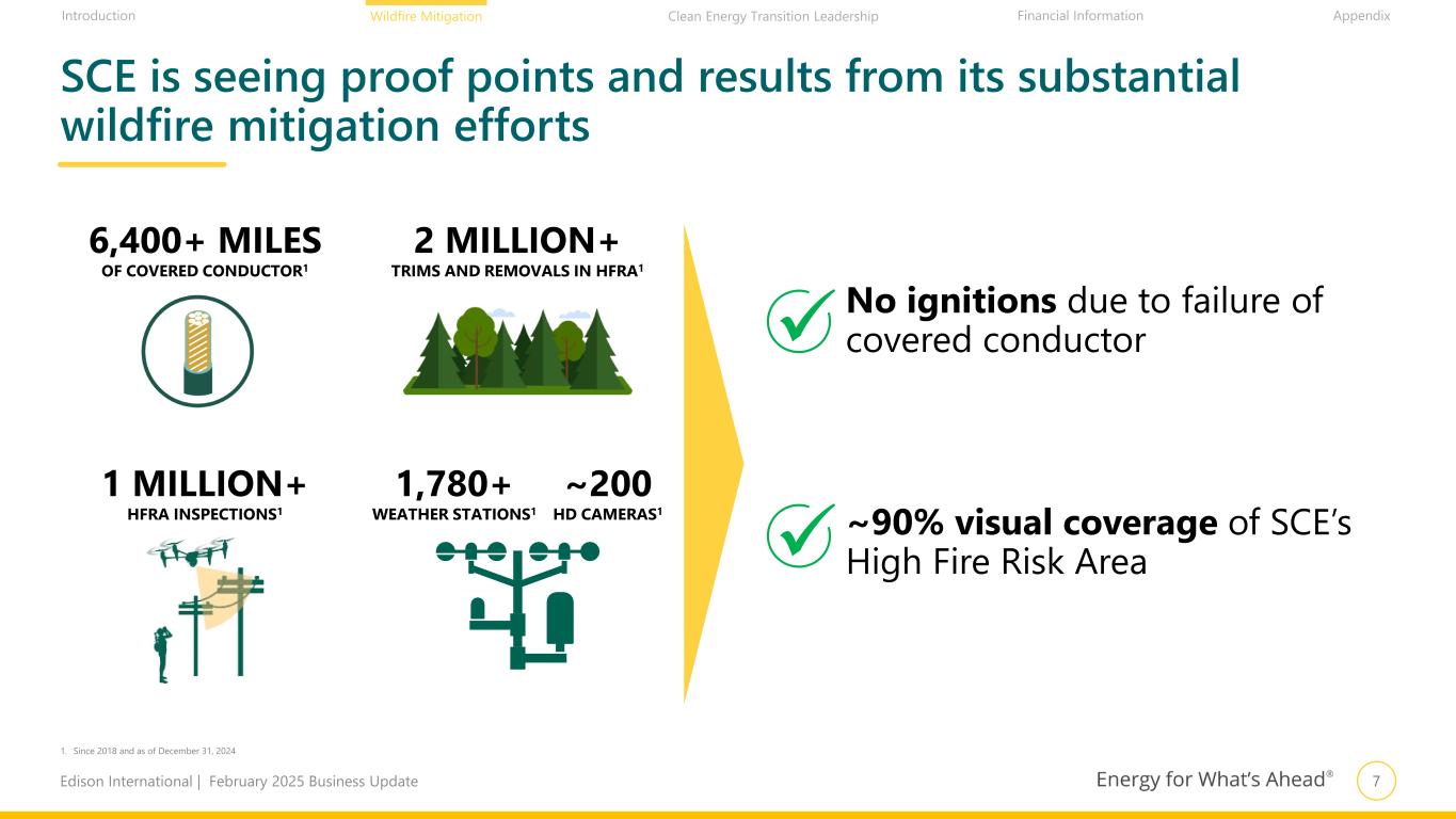 6Edison International | February 2025 Business Update Financial Information AppendixIntroduction Clean Energy Transition LeadershipWildfire Mitigation AB 1054 (2019) SB 599 (2022) SCE Safety Certification Wildfire Insurance Fund AB 1054-Related Edison for the Record Map of SCE’s Service Area Stories and Videos on SCE’s Wildfire Mitigation Efforts and PSPS Energized by Edison Wildfire Mitigation Newsletter Other Useful Links and Resources1 Weather Stations Wildfire Cameras PSPS Information PSPS Decision Making Role of Weather in PSPS SCE Wildfire Safety Webpage Wildfire Mitigation Plan & Related Documents Vegetation Management Southern California Wildfires Document Library (including ESIRs and Section 315 letters) Situational Awareness Wildfire Mitigation 1. This page contains links to third-party websites, provided for the convenience of investors. Direct links to documents and information issued by third parties are provided on this page should not be construed as an endorsement or adoption of or an agreement with such content by Edison International or SCE. Third-party content is the responsibility of the third-party, and Edison International and SCE disclaim all liability for any statements made in such third-party content