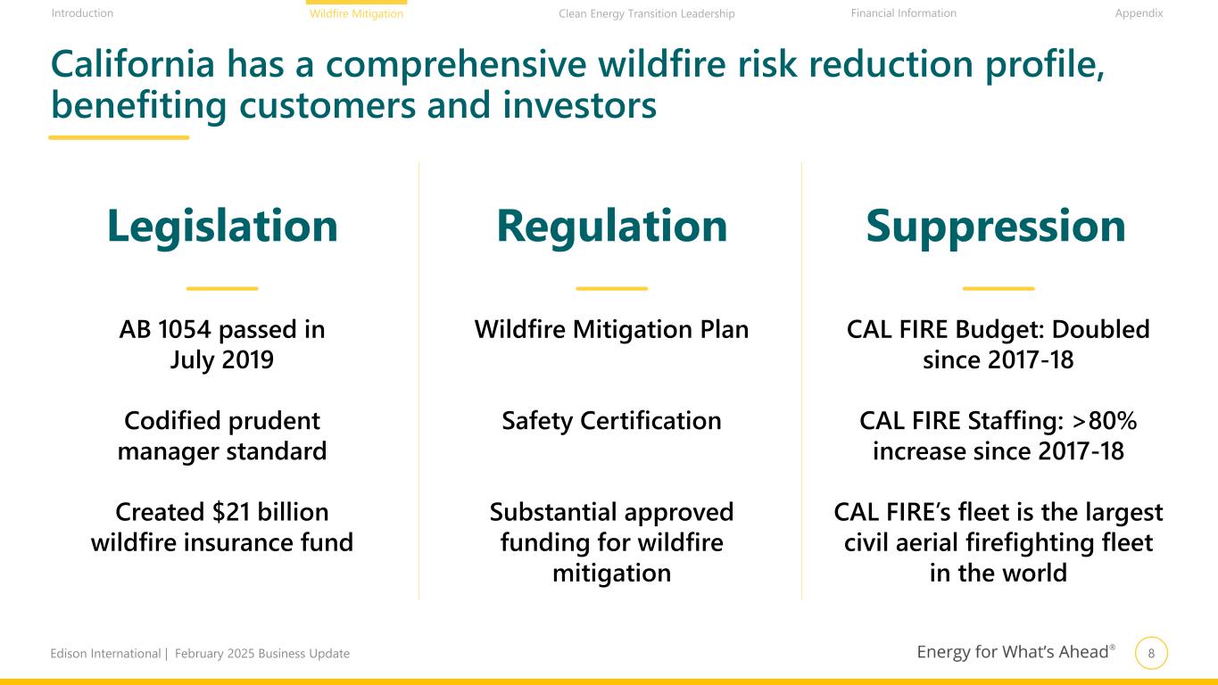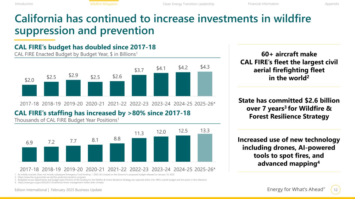 12Edison International | February 2025 Business Update Financial Information AppendixIntroduction Clean Energy Transition LeadershipWildfire Mitigation $2.0 $2.5 $2.9 $2.5 $2.6 $3.7 $4.1 $4.2 $4.3 2017-18 2018-19 2019-20 2020-21 2021-22 2022-23 2023-24 2024-25 2025-26* California has continued to increase investments in wildfire suppression and prevention 60+ aircraft make CAL FIRE’s fleet the largest civil aerial firefighting fleet in the world2 1. As initially enacted. Does not include subsequent Emergency Fund funding. *: 2025-26 is based on the Governor’s proposed budget released on January 10, 2025 2. https://www.fire.ca.gov/what-we-do/fire-protection/aviation-program 3. Budgeted across departments and budget years Portions of the funding for the Wildfire & Forest Resilience Strategy are captured within CAL FIRE’s overall budget and the action in this reference 4. https://www.gov.ca.gov/2025/01/13/california-forest-management-hotter-drier-climate/ CAL FIRE’s budget has doubled since 2017-18 CAL FIRE Enacted Budget by Budget Year, $ in Billions1 CAL FIRE’s staffing has increased by >80% since 2017-18 Thousands of CAL FIRE Budget Year Positions1 6.9 7.2 7.7 8.1 8.8 11.3 12.0 12.5 13.3 2017-18 2018-19 2019-20 2020-21 2021-22 2022-23 2023-24 2024-25 2025-26* State has committed $2.6 billion over 7 years3 for Wildfire & Forest Resilience Strategy Increased use of new technology including drones, AI-powered tools to spot fires, and advanced mapping4