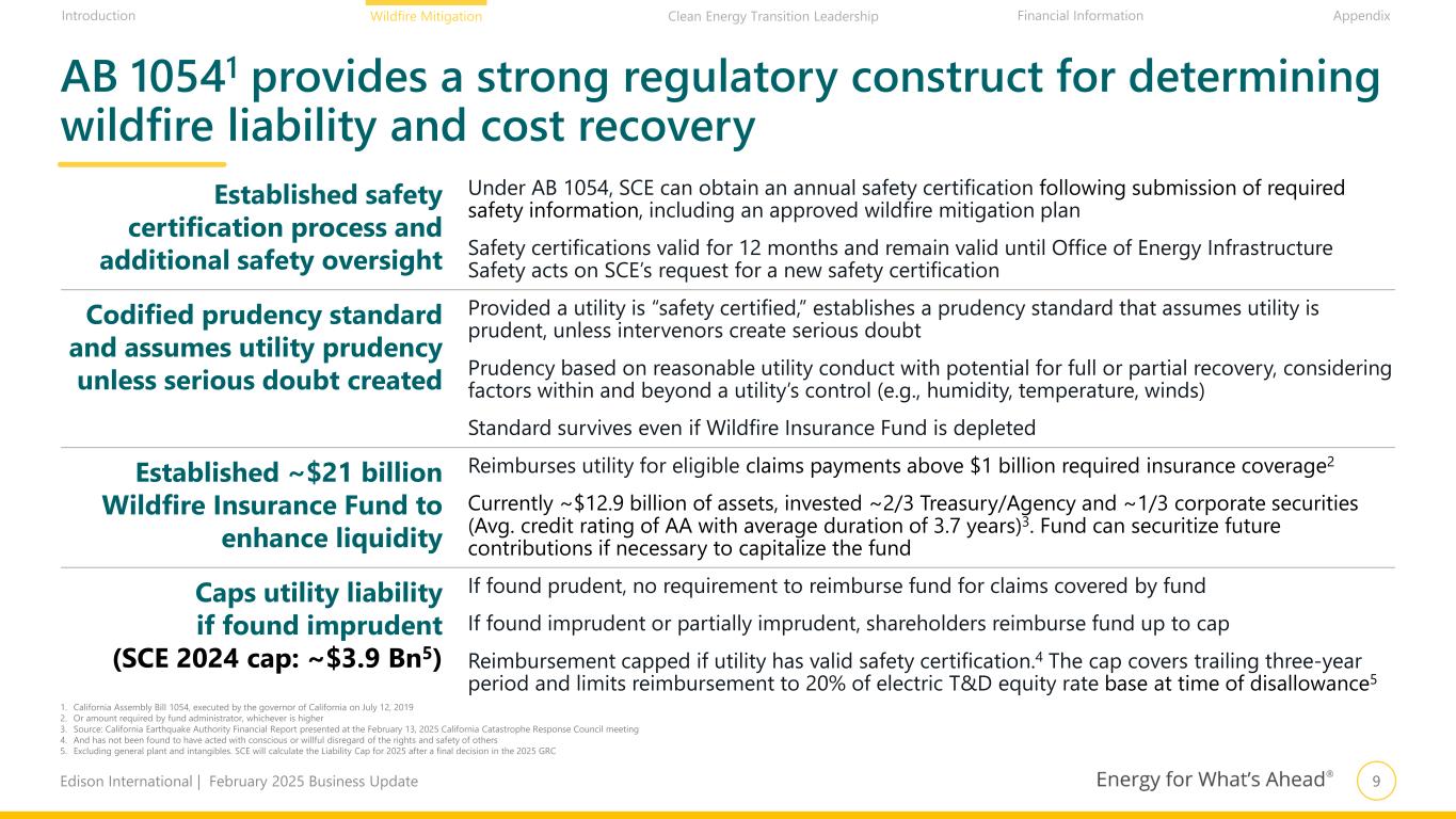 8Edison International | February 2025 Business Update Financial Information AppendixIntroduction Clean Energy Transition LeadershipWildfire Mitigation California has a comprehensive wildfire risk reduction profile, benefiting customers and investors Suppression CAL FIRE Budget: Doubled since 2017-18 CAL FIRE Staffing: >80% increase since 2017-18 CAL FIRE’s fleet is the largest civil aerial firefighting fleet in the world Legislation AB 1054 passed in July 2019 Codified prudent manager standard Created $21 billion wildfire insurance fund Regulation Wildfire Mitigation Plan Safety Certification Substantial approved funding for wildfire mitigation