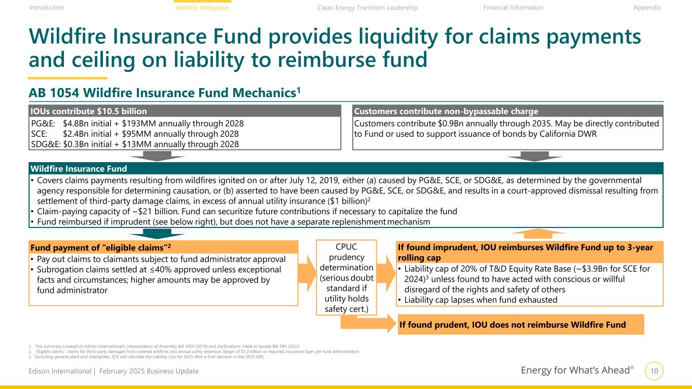 9Edison International | February 2025 Business Update Financial Information AppendixIntroduction Clean Energy Transition LeadershipWildfire Mitigation AB 10541 provides a strong regulatory construct for determining wildfire liability and cost recovery Established safety certification process and additional safety oversight Under AB 1054, SCE can obtain an annual safety certification following submission of required safety information, including an approved wildfire mitigation plan Safety certifications valid for 12 months and remain valid until Office of Energy Infrastructure Safety acts on SCE’s request for a new safety certification Codified prudency standard and assumes utility prudency unless serious doubt created Provided a utility is “safety certified,” establishes a prudency standard that assumes utility is prudent, unless intervenors create serious doubt Prudency based on reasonable utility conduct with potential for full or partial recovery, considering factors within and beyond a utility’s control (e.g., humidity, temperature, winds) Standard survives even if Wildfire Insurance Fund is depleted Established ~$21 billion Wildfire Insurance Fund to enhance liquidity Reimburses utility for eligible claims payments above $1 billion required insurance coverage2 Currently ~$12.9 billion of assets, invested ~2/3 Treasury/Agency and ~1/3 corporate securities (Avg. credit rating of AA with average duration of 3.7 years)3. Fund can securitize future contributions if necessary to capitalize the fund Caps utility liability if found imprudent (SCE 2024 cap: ~$3.9 Bn5) If found prudent, no requirement to reimburse fund for claims covered by fund If found imprudent or partially imprudent, shareholders reimburse fund up to cap Reimbursement capped if utility has valid safety certification.4 The cap covers trailing three-year period and limits reimbursement to 20% of electric T&D equity rate base at time of disallowance5 1. California Assembly Bill 1054, executed by the governor of California on July 12, 2019 2. Or amount required by fund administrator, whichever is higher 3. Source: California Earthquake Authority Financial Report presented at the February 13, 2025 California Catastrophe Response Council meeting 4. And has not been found to have acted with conscious or willful disregard of the rights and safety of others 5. Excluding general plant and intangibles. SCE will calculate the Liability Cap for 2025 after a final decision in the 2025 GRC