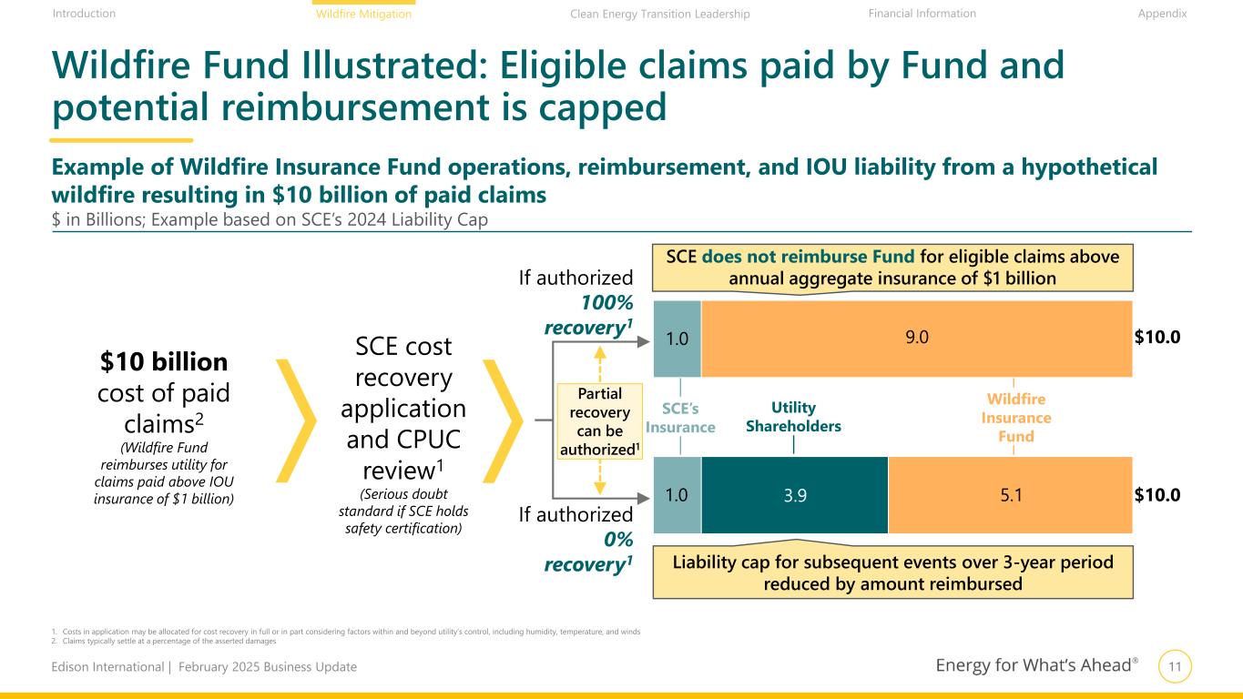 10Edison International | February 2025 Business Update Financial Information AppendixIntroduction Clean Energy Transition LeadershipWildfire Mitigation Wildfire Insurance Fund provides liquidity for claims payments and ceiling on liability to reimburse fund AB 1054 Wildfire Insurance Fund Mechanics1 1. This summary is based on Edison International’s interpretation of Assembly Bill 1054 (2019) and clarifications made in Senate Bill 599 (2022) 2. “Eligible claims”: claims for third-party damages from covered wildfires less annual utility retention (larger of $1.0 billion or required insurance layer per fund administrator) 3. Excluding general plant and intangibles. SCE will calculate the Liability Cap for 2025 after a final decision in the 2025 GRC • Pay out claims to claimants subject to fund administrator approval • Subrogation claims settled at ≤40% approved unless exceptional facts and circumstances; higher amounts may be approved by fund administrator Fund payment of “eligible claims”2 CPUC prudency determination (serious doubt standard if utility holds safety cert.) • Covers claims payments resulting from wildfires ignited on or after July 12, 2019, either (a) caused by PG&E, SCE, or SDG&E, as determined by the governmental agency responsible for determining causation, or (b) asserted to have been caused by PG&E, SCE, or SDG&E, and results in a court-approved dismissal resulting from settlement of third-party damage claims, in excess of annual utility insurance ($1 billion)2 • Claim-paying capacity of ~$21 billion. Fund can securitize future contributions if necessary to capitalize the fund • Fund reimbursed if imprudent (see below right), but does not have a separate replenishment mechanism Wildfire Insurance Fund • Liability cap of 20% of T&D Equity Rate Base (~$3.9Bn for SCE for 2024)3 unless found to have acted with conscious or willful disregard of the rights and safety of others • Liability cap lapses when fund exhausted If found imprudent, IOU reimburses Wildfire Fund up to 3-year rolling cap If found prudent, IOU does not reimburse Wildfire Fund PG&E: $4.8Bn initial + $193MM annually through 2028 SCE: $2.4Bn initial + $95MM annually through 2028 SDG&E: $0.3Bn initial + $13MM annually through 2028 IOUs contribute $10.5 billion Customers contribute $0.9Bn annually through 2035. May be directly contributed to Fund or used to support issuance of bonds by California DWR Customers contribute non-bypassable charge