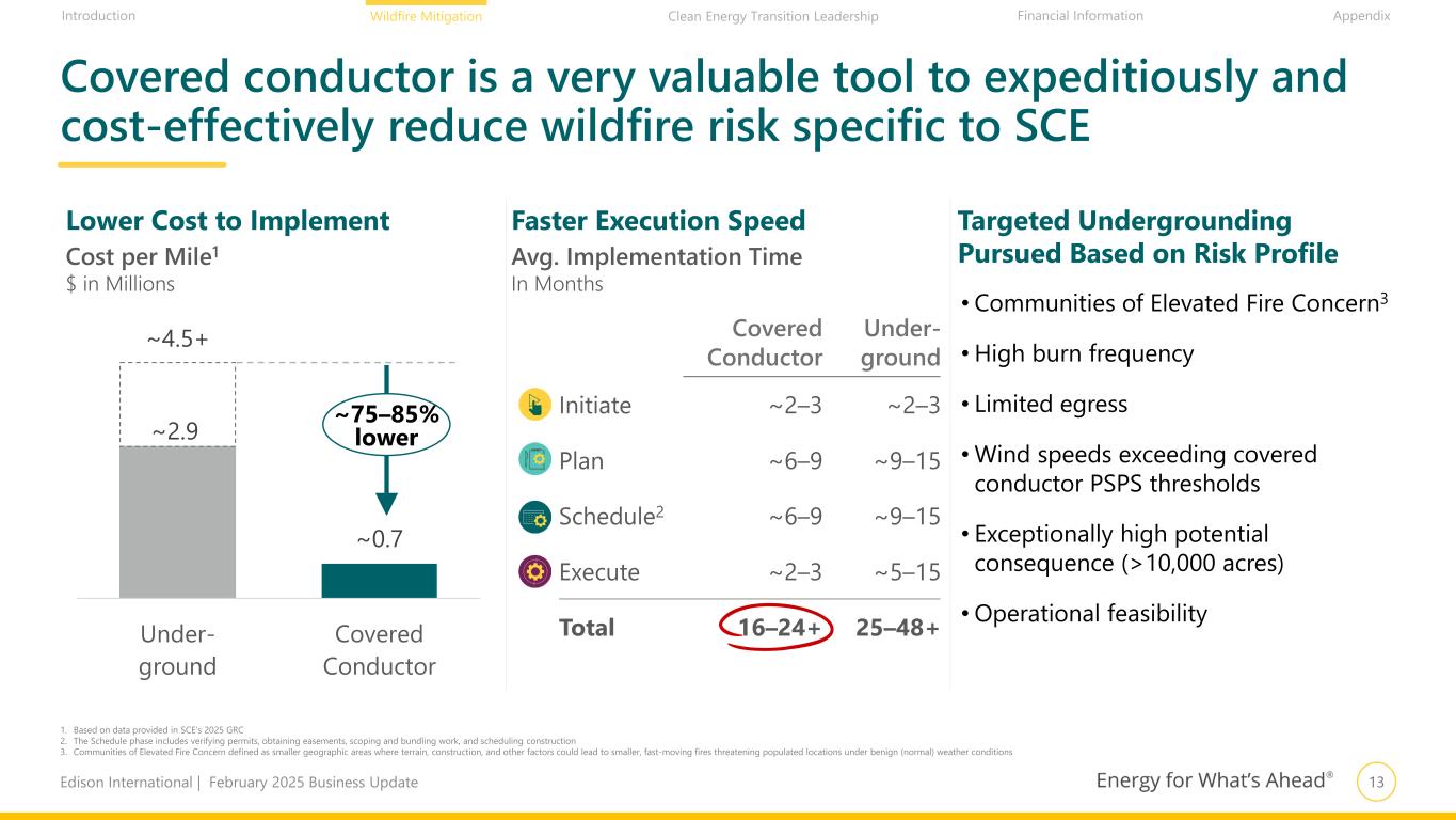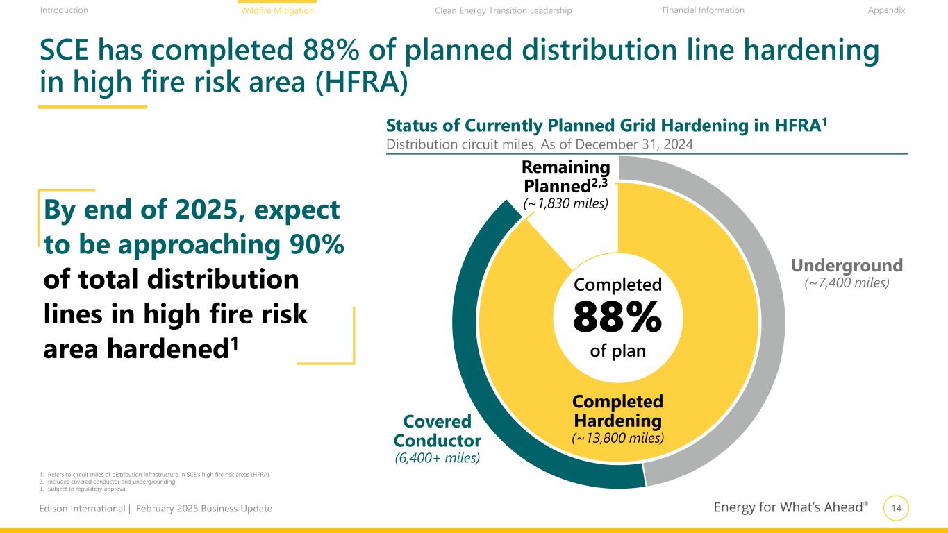 13Edison International | February 2025 Business Update Financial Information AppendixIntroduction Clean Energy Transition LeadershipWildfire Mitigation Covered conductor is a very valuable tool to expeditiously and cost-effectively reduce wildfire risk specific to SCE ~2.9 ~4.5+ ~0.7 Under- ground Covered Conductor ~75–85% lower • Communities of Elevated Fire Concern3 • High burn frequency • Limited egress • Wind speeds exceeding covered conductor PSPS thresholds • Exceptionally high potential consequence (>10,000 acres) • Operational feasibility Cost per Mile1 $ in Millions Avg. Implementation Time In Months 1. Based on data provided in SCE’s 2025 GRC 2. The Schedule phase includes verifying permits, obtaining easements, scoping and bundling work, and scheduling construction 3. Communities of Elevated Fire Concern defined as smaller geographic areas where terrain, construction, and other factors could lead to smaller, fast-moving fires threatening populated locations under benign (normal) weather conditions Targeted Undergrounding Pursued Based on Risk Profile Lower Cost to Implement Faster Execution Speed Covered Conductor Under- ground Initiate ~2–3 ~2–3 Plan ~6–9 ~9–15 Schedule2 ~6–9 ~9–15 Execute ~2–3 ~5–15 Total 16–24+ 25–48+