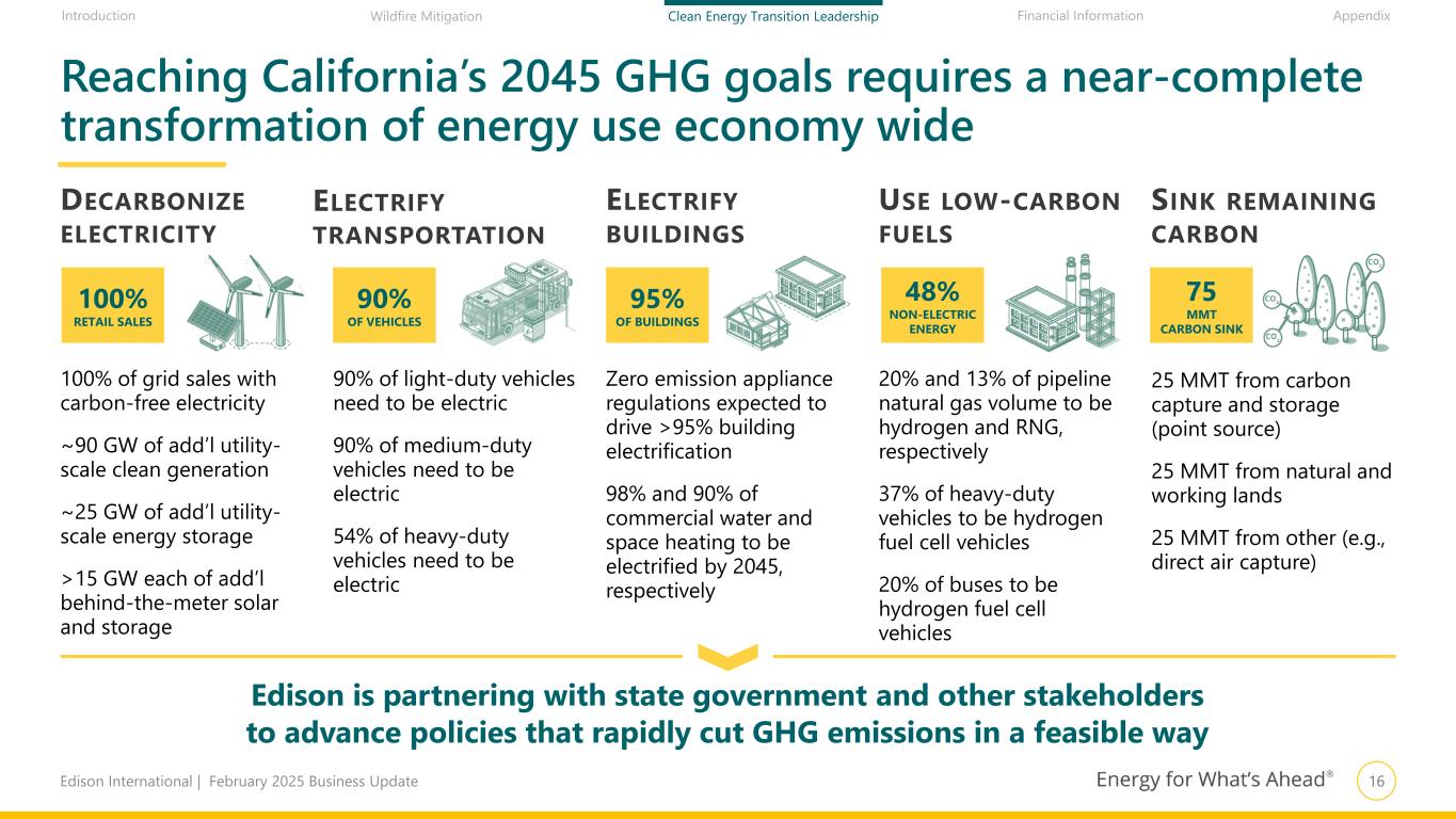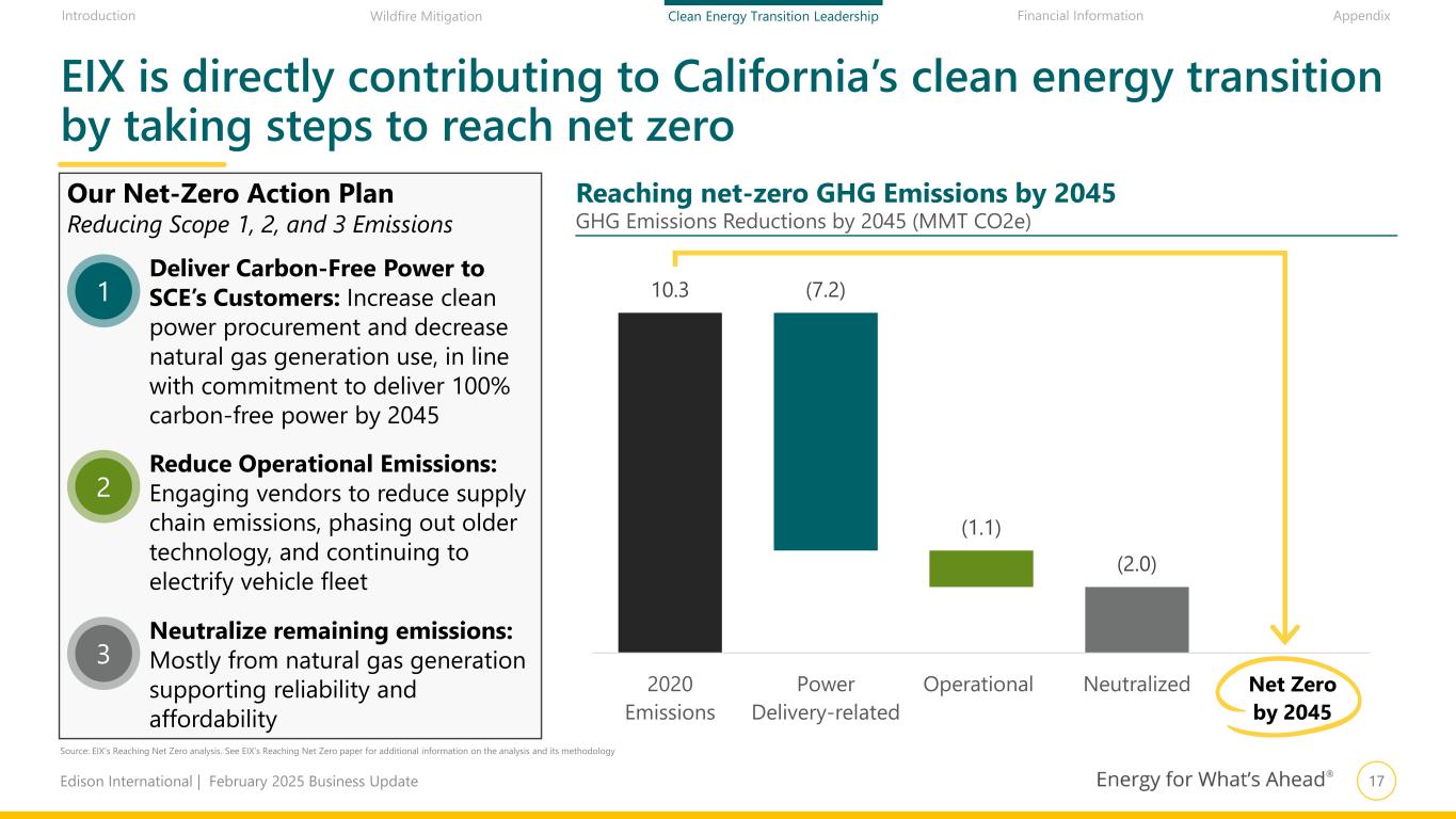 16Edison International | February 2025 Business Update Financial Information AppendixIntroduction Clean Energy Transition LeadershipWildfire Mitigation Reaching California’s 2045 GHG goals requires a near-complete transformation of energy use economy wide 100% of grid sales with carbon-free electricity ~90 GW of add’l utility- scale clean generation ~25 GW of add’l utility- scale energy storage >15 GW each of add’l behind-the-meter solar and storage Zero emission appliance regulations expected to drive >95% building electrification 98% and 90% of commercial water and space heating to be electrified by 2045, respectively 90% of light-duty vehicles need to be electric 90% of medium-duty vehicles need to be electric 54% of heavy-duty vehicles need to be electric 20% and 13% of pipeline natural gas volume to be hydrogen and RNG, respectively 37% of heavy-duty vehicles to be hydrogen fuel cell vehicles 20% of buses to be hydrogen fuel cell vehicles Edison is partnering with state government and other stakeholders to advance policies that rapidly cut GHG emissions in a feasible way 25 MMT from carbon capture and storage (point source) 25 MMT from natural and working lands 25 MMT from other (e.g., direct air capture) DECARBONIZE ELECTRICITY ELECTRIFY TRANSPORTATION ELECTRIFY BUILDINGS USE LOW-CARBON FUELS SINK REMAINING CARBON 100% RETAIL SALES 90% OF VEHICLES 95% OF BUILDINGS 48% NON-ELECTRIC ENERGY 75 MMT CARBON SINK