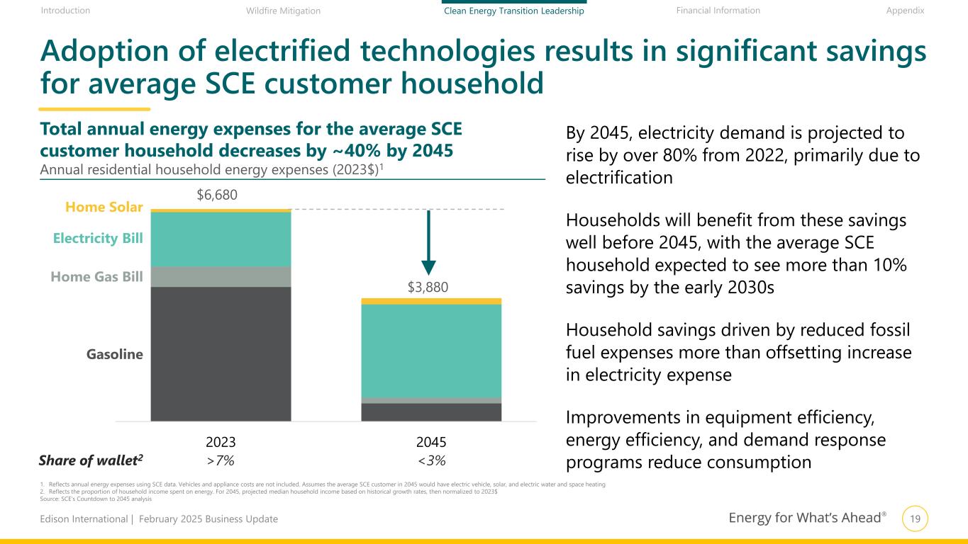 18Edison International | February 2025 Business Update Financial Information AppendixIntroduction Clean Energy Transition LeadershipWildfire Mitigation Load growth of 80% by 2045 requires a significant acceleration in grid expansion Source: SCE’s Countdown to 2045 analysis. See Countdown to 2045 Appendices for additional information on the analysis and its methodology. Growth estimates are relative to 2022 CAISO Grid Investment 2033–2045 At least half of incremental grid investment fits squarely within IOU jurisdictions Incremental CAISO-wide grid investment ~$125 billion (2023$) Transmission for Out-of-State Imports ISO Interconnections Distribution Subtransmission Infrastructure to interconnect and integrate resources May be mix of investment by utilities, generators, and other market participants Utility infrastructure additions and upgrades Predominantly investments by utilities in their service areas New transmission and distribution grid projects need to be added at up to 4x and 10x historical rates, respectively SCE expects distribution system to be 25% larger by 2045 – Equivalent of 85 new distribution substations – Upgrades to 345 of 900 existing substations – 1,400 new distribution circuits (30% more than today) +20,000 circuit miles of 500 kV transmission CAISO-wide to interconnect new resources