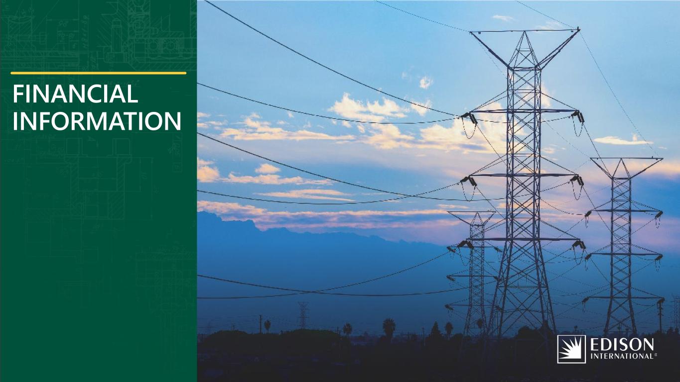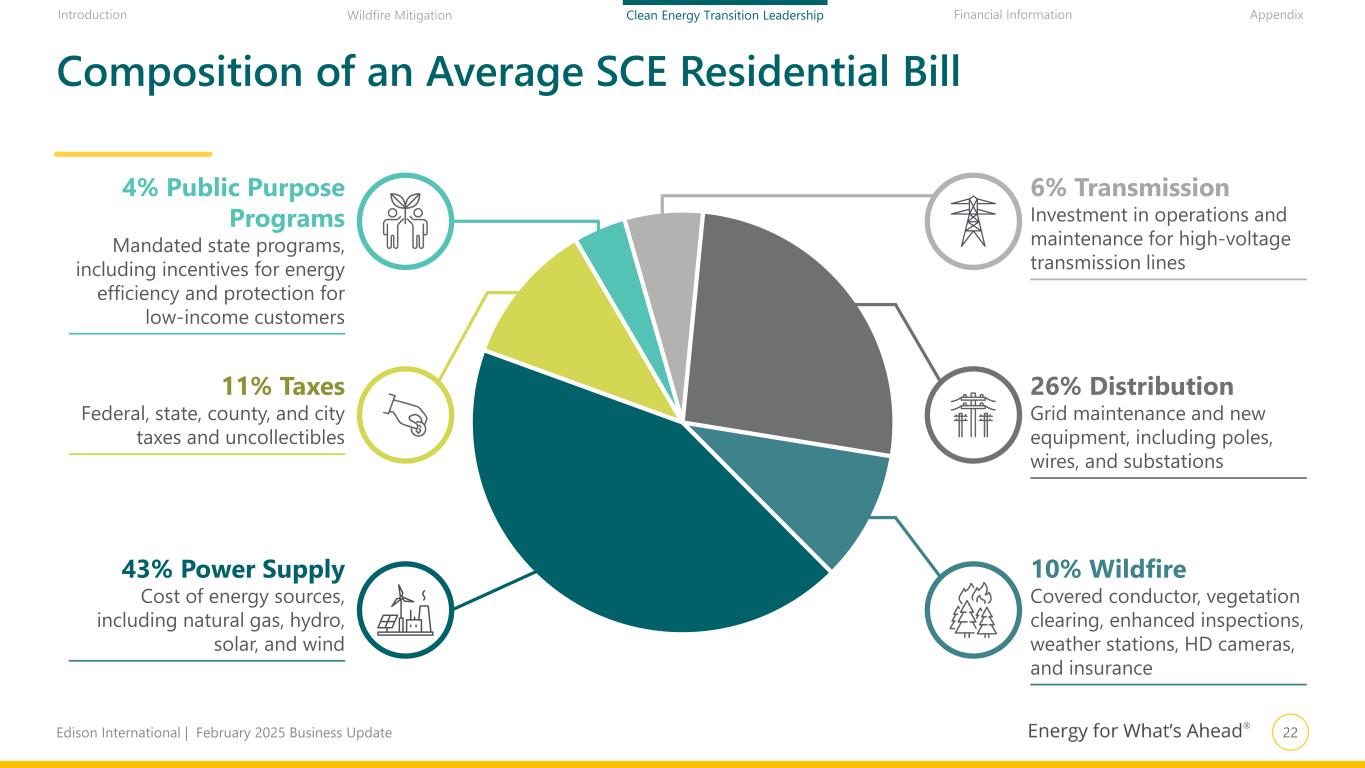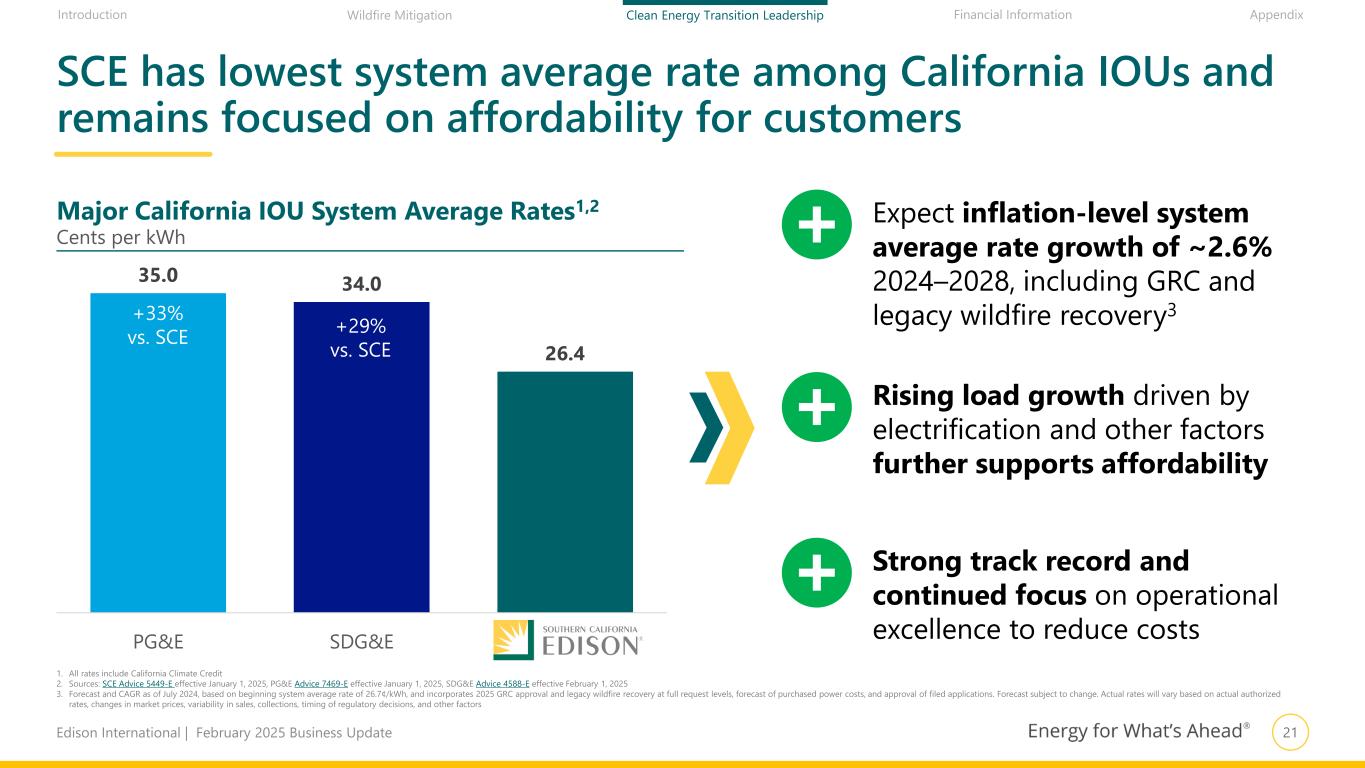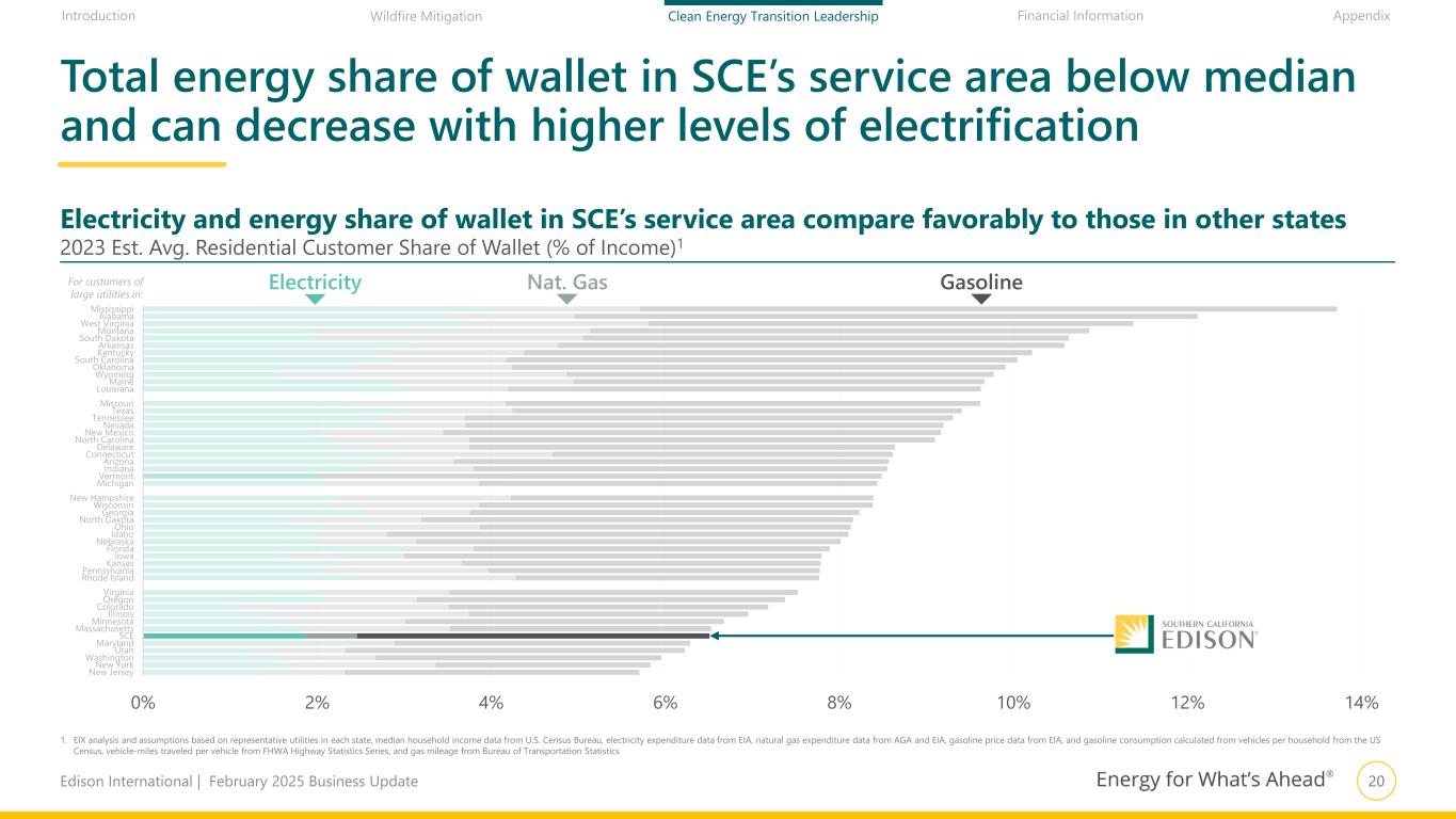 20Edison International | February 2025 Business Update Financial Information AppendixIntroduction Clean Energy Transition LeadershipWildfire Mitigation 0% 2% 4% 6% 8% 10% 12% 14% Mississippi Alabama West Virginia Montana South Dakota Arkansas Kentucky South Carolina Oklahoma Wyoming Maine Louisiana Missouri Texas Tennessee Nevada New Mexico North Carolina Delaware Connecticut Arizona Indiana Vermont Michigan New Hampshire Wisconsin Georgia North Dakota Ohio Idaho Nebraska Florida Iowa Kansas Pennsylvania Rhode Island Virginia Oregon Colorado Illinois Minnesota Massachusetts SCE Maryland Utah Washington New York New Jersey Total energy share of wallet in SCE’s service area below median and can decrease with higher levels of electrification 2023 Est. Avg. Residential Customer Share of Wallet (% of Income)1 Electricity Nat. Gas GasolineFor customers of large utilities in: Electricity and energy share of wallet in SCE’s service area compare favorably to those in other states 1. EIX analysis and assumptions based on representative utilities in each state, median household income data from U.S. Census Bureau, electricity expenditure data from EIA, natural gas expenditure data from AGA and EIA, gasoline price data from EIA, and gasoline consumption calculated from vehicles per household from the US Census, vehicle-miles traveled per vehicle from FHWA Highway Statistics Series, and gas mileage from Bureau of Transportation Statistics
