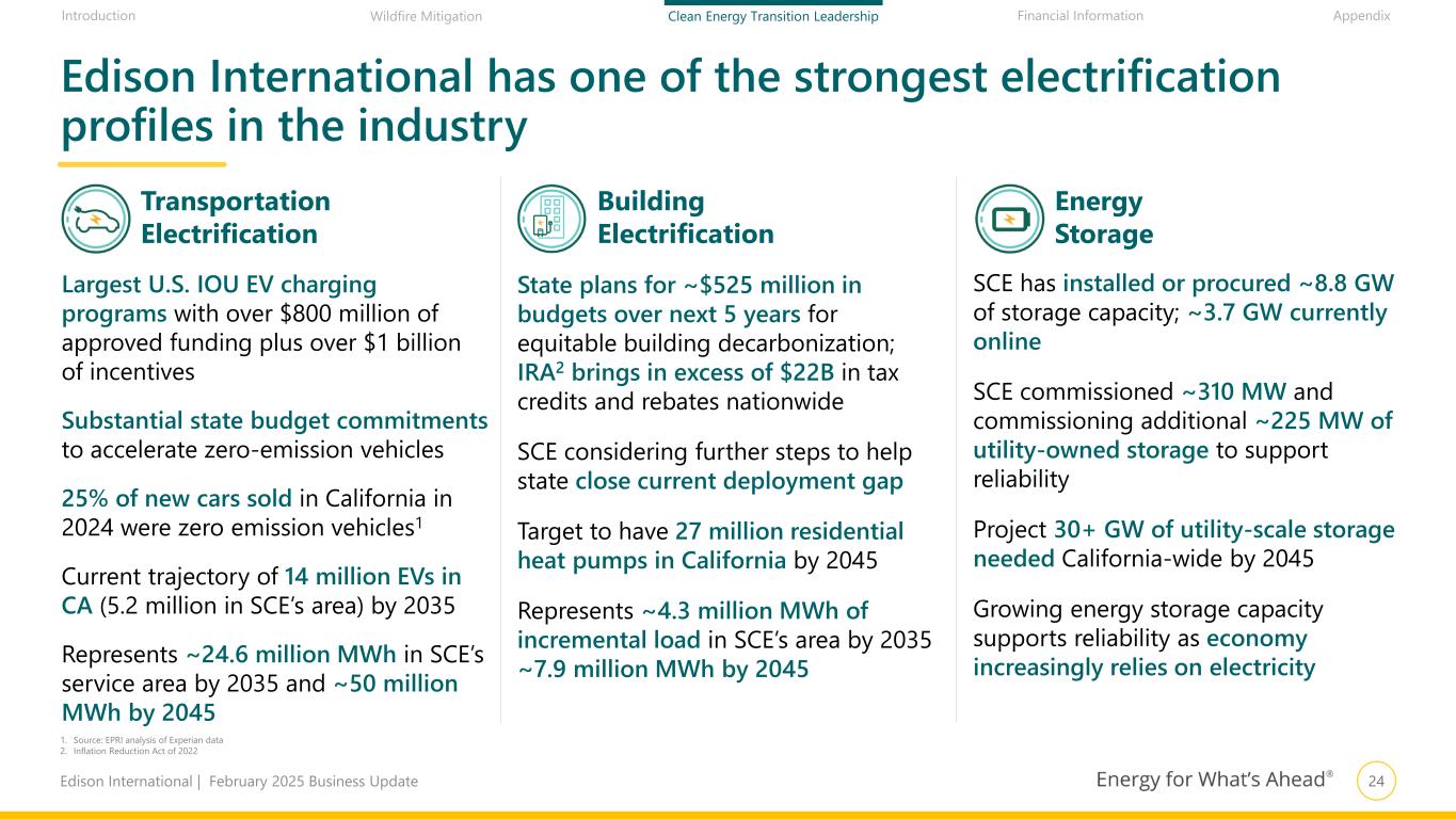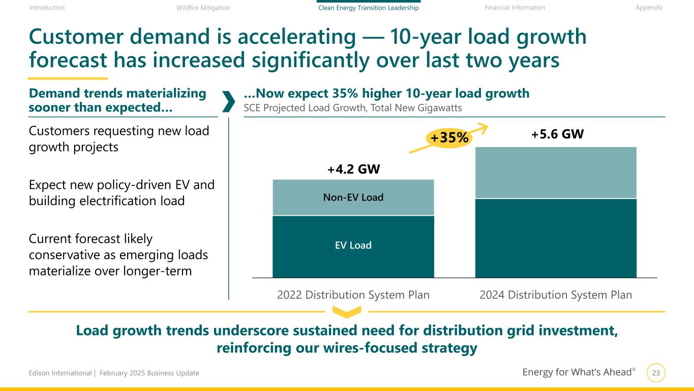 23Edison International | February 2025 Business Update Financial Information AppendixIntroduction Clean Energy Transition LeadershipWildfire Mitigation Customer demand is accelerating — 10-year load growth forecast has increased significantly over last two years 2022 Distribution System Plan 2024 Distribution System Plan +4.2 GW +5.6 GW EV Load Non-EV Load …Now expect 35% higher 10-year load growth SCE Projected Load Growth, Total New Gigawatts Load growth trends underscore sustained need for distribution grid investment, reinforcing our wires-focused strategy +35%Customers requesting new load growth projects Expect new policy-driven EV and building electrification load Current forecast likely conservative as emerging loads materialize over longer-term Demand trends materializing sooner than expected…