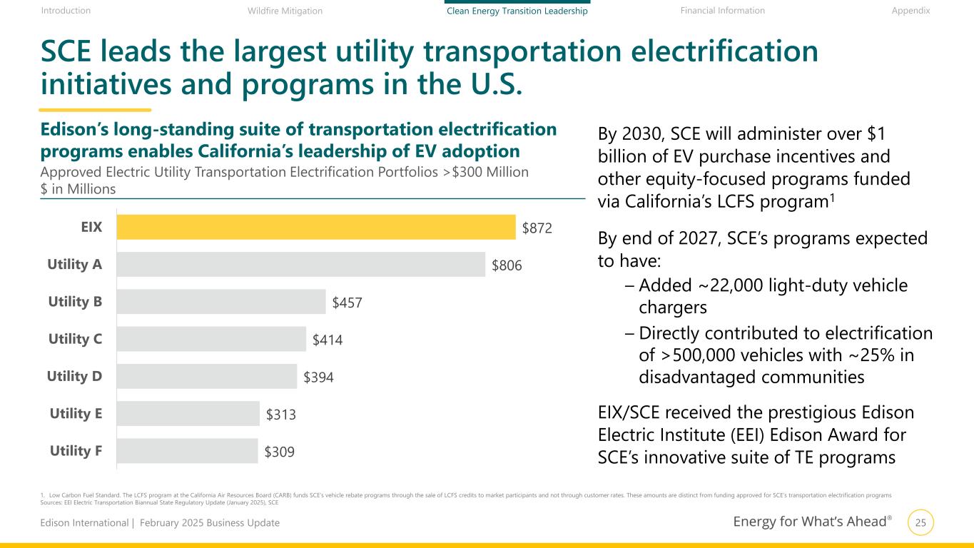 24Edison International | February 2025 Business Update Financial Information AppendixIntroduction Clean Energy Transition LeadershipWildfire Mitigation Edison International has one of the strongest electrification profiles in the industry 1. Source: EPRI analysis of Experian data 2. Inflation Reduction Act of 2022 State plans for ~$525 million in budgets over next 5 years for equitable building decarbonization; IRA2 brings in excess of $22B in tax credits and rebates nationwide SCE considering further steps to help state close current deployment gap Target to have 27 million residential heat pumps in California by 2045 Represents ~4.3 million MWh of incremental load in SCE’s area by 2035 ~7.9 million MWh by 2045 SCE has installed or procured ~8.8 GW of storage capacity; ~3.7 GW currently online SCE commissioned ~310 MW and commissioning additional ~225 MW of utility-owned storage to support reliability Project 30+ GW of utility-scale storage needed California-wide by 2045 Growing energy storage capacity supports reliability as economy increasingly relies on electricity Largest U.S. IOU EV charging programs with over $800 million of approved funding plus over $1 billion of incentives Substantial state budget commitments to accelerate zero-emission vehicles 25% of new cars sold in California in 2024 were zero emission vehicles1 Current trajectory of 14 million EVs in CA (5.2 million in SCE’s area) by 2035 Represents ~24.6 million MWh in SCE’s service area by 2035 and ~50 million MWh by 2045 Transportation Electrification Energy Storage Building Electrification