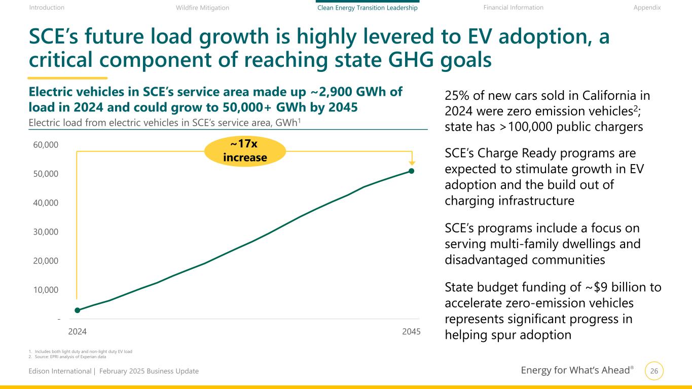 26Edison International | February 2025 Business Update Financial Information AppendixIntroduction Clean Energy Transition LeadershipWildfire Mitigation SCE’s future load growth is highly levered to EV adoption, a critical component of reaching state GHG goals 1. Includes both light duty and non-light duty EV load 2. Source: EPRI analysis of Experian data 25% of new cars sold in California in 2024 were zero emission vehicles2; state has >100,000 public chargers SCE’s Charge Ready programs are expected to stimulate growth in EV adoption and the build out of charging infrastructure SCE’s programs include a focus on serving multi-family dwellings and disadvantaged communities State budget funding of ~$9 billion to accelerate zero-emission vehicles represents significant progress in helping spur adoption - 10,000 20,000 30,000 40,000 50,000 60,000 2024 2045 Electric vehicles in SCE’s service area made up ~2,900 GWh of load in 2024 and could grow to 50,000+ GWh by 2045 Electric load from electric vehicles in SCE’s service area, GWh1 ~17x increase