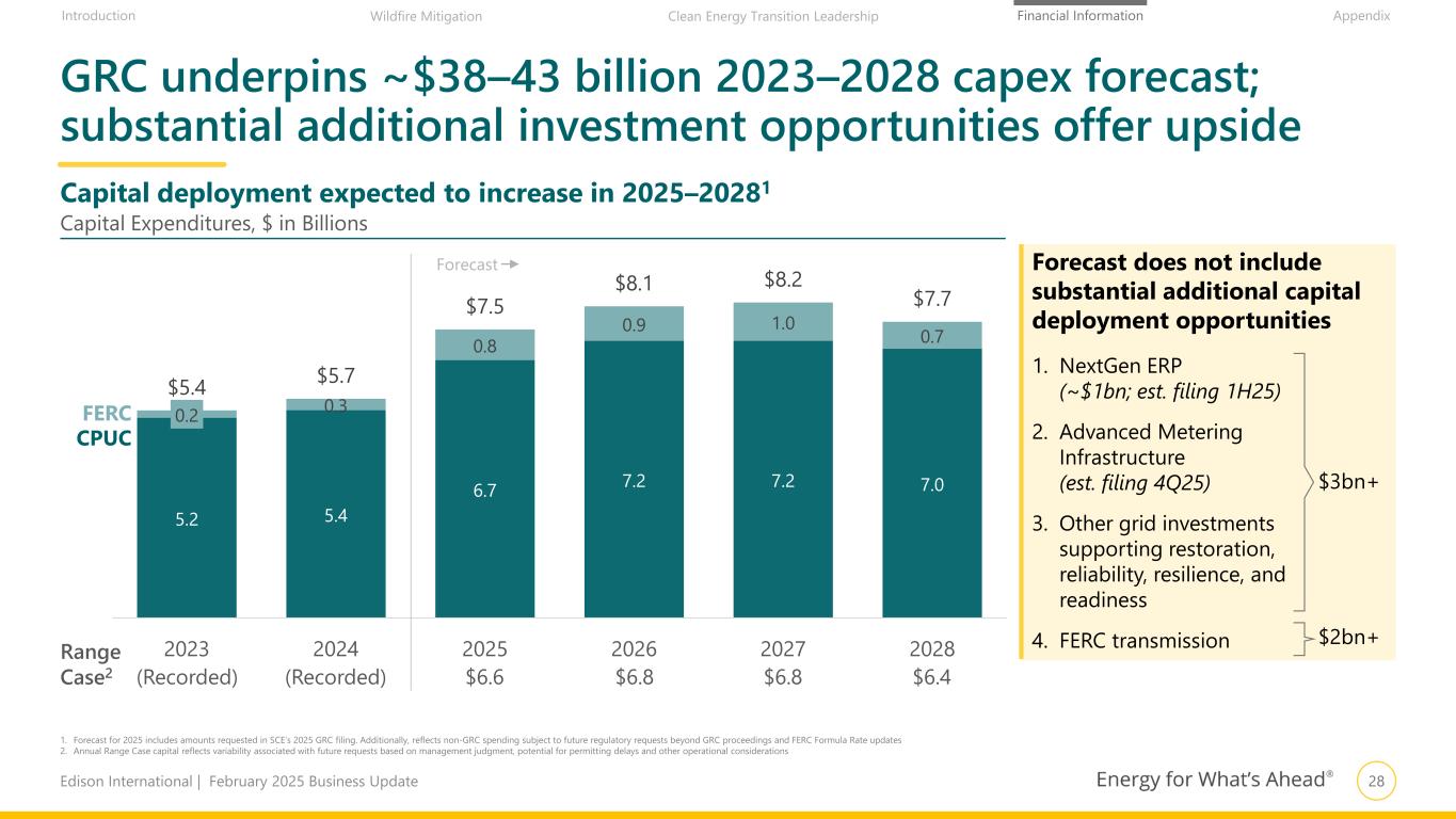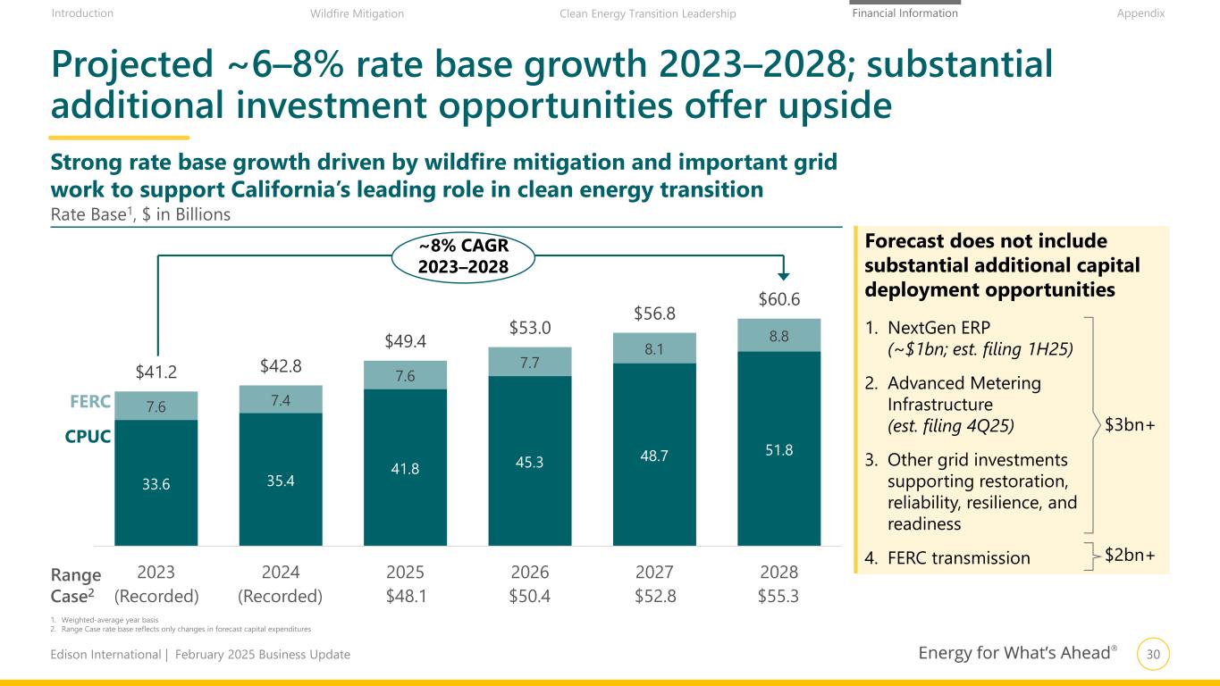 30Edison International | February 2025 Business Update Financial Information AppendixIntroduction Clean Energy Transition LeadershipWildfire Mitigation 33.6 35.4 41.8 45.3 48.7 51.8 7.6 7.4 7.6 7.7 8.1 8.8 $41.2 $42.8 $49.4 $53.0 $56.8 $60.6 2023 2024 2025 2026 2027 2028 Projected ~6–8% rate base growth 2023–2028; substantial additional investment opportunities offer upside CPUC FERC ~8% CAGR 2023–2028 Rate Base1, $ in Billions Strong rate base growth driven by wildfire mitigation and important grid work to support California’s leading role in clean energy transition Range Case2 (Recorded) (Recorded) $48.1 $50.4 $52.8 $55.3 1. Weighted-average year basis 2. Range Case rate base reflects only changes in forecast capital expenditures Forecast does not include substantial additional capital deployment opportunities 1. NextGen ERP (~$1bn; est. filing 1H25) 2. Advanced Metering Infrastructure (est. filing 4Q25) 3. Other grid investments supporting restoration, reliability, resilience, and readiness 4. FERC transmission $3bn+ $2bn+