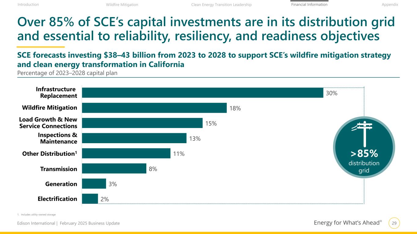 29Edison International | February 2025 Business Update Financial Information AppendixIntroduction Clean Energy Transition LeadershipWildfire Mitigation Over 85% of SCE’s capital investments are in its distribution grid and essential to reliability, resiliency, and readiness objectives 30% 18% 15% 13% 11% 8% 3% 2% Infrastructure Replacement Wildfire Mitigation Load Growth & New Service Connections Inspections & Maintenance Other Distribution1 Transmission Generation Electrification >85% distribution grid SCE forecasts investing $38–43 billion from 2023 to 2028 to support SCE’s wildfire mitigation strategy and clean energy transformation in California Percentage of 2023–2028 capital plan 1. Includes utility-owned storage