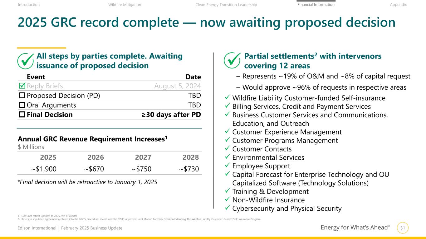 31Edison International | February 2025 Business Update Financial Information AppendixIntroduction Clean Energy Transition LeadershipWildfire Mitigation 2025 GRC record complete — now awaiting proposed decision 1. Does not reflect updates to 2025 cost of capital 2. Refers to stipulated agreements entered into the GRC’s procedural record and the CPUC-approved Joint Motion For Early Decision Extending The Wildfire Liability Customer-Funded Self-Insurance Program All steps by parties complete. Awaiting issuance of proposed decision  Partial settlements2 with intervenors covering 12 areas – Represents ~19% of O&M and ~8% of capital request – Would approve ~96% of requests in respective areas Annual GRC Revenue Requirement Increases1 $ Millions 2025 2026 2027 2028 ~$1,900 ~$670 ~$750 ~$730 Event Date Reply Briefs August 5, 2024 Proposed Decision (PD) TBD Oral Arguments TBD Final Decision ≥30 days after PD Wildfire Liability Customer-funded Self-insurance  Billing Services, Credit and Payment Services  Business Customer Services and Communications, Education, and Outreach  Customer Experience Management  Customer Programs Management  Customer Contacts  Environmental Services  Employee Support  Capital Forecast for Enterprise Technology and OU Capitalized Software (Technology Solutions)  Training & Development  Non-Wildfire Insurance  Cybersecurity and Physical Security *Final decision will be retroactive to January 1, 2025