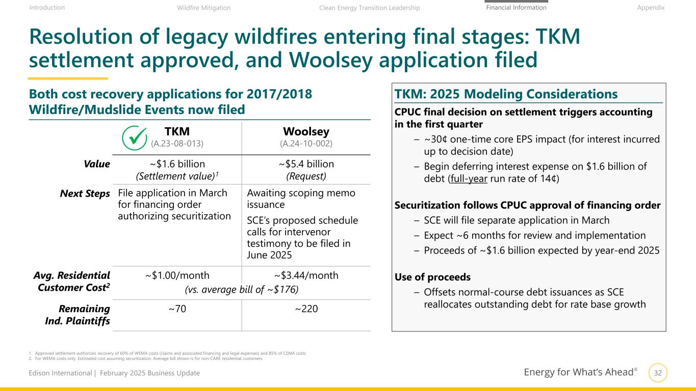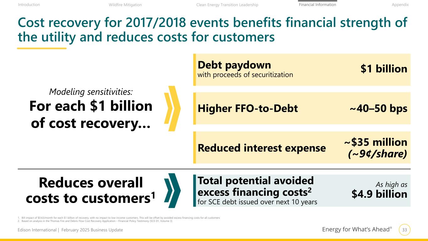 32Edison International | February 2025 Business Update Financial Information AppendixIntroduction Clean Energy Transition LeadershipWildfire Mitigation Resolution of legacy wildfires entering final stages: TKM settlement approved, and Woolsey application filed TKM (A.23-08-013) Woolsey (A.24-10-002) Value ~$1.6 billion (Settlement value)1 ~$5.4 billion (Request) Next Steps File application in March for financing order authorizing securitization Awaiting scoping memo issuance SCE’s proposed schedule calls for intervenor testimony to be filed in June 2025 Avg. Residential Customer Cost2 ~$1.00/month ~$3.44/month (vs. average bill of ~$176) Remaining Ind. Plaintiffs ~70 ~220 TKM: 2025 Modeling ConsiderationsBoth cost recovery applications for 2017/2018 Wildfire/Mudslide Events now filed 1. Approved settlement authorizes recovery of 60% of WEMA costs (claims and associated financing and legal expenses) and 85% of CEMA costs 2. For WEMA costs only. Estimated cost assuming securitization. Average bill shown is for non-CARE residential customers CPUC final decision on settlement triggers accounting in the first quarter – ~30¢ one-time core EPS impact (for interest incurred up to decision date) – Begin deferring interest expense on $1.6 billion of debt (full-year run rate of 14¢) Securitization follows CPUC approval of financing order – SCE will file separate application in March – Expect ~6 months for review and implementation – Proceeds of ~$1.6 billion expected by year-end 2025 Use of proceeds – Offsets normal-course debt issuances as SCE reallocates outstanding debt for rate base growth 