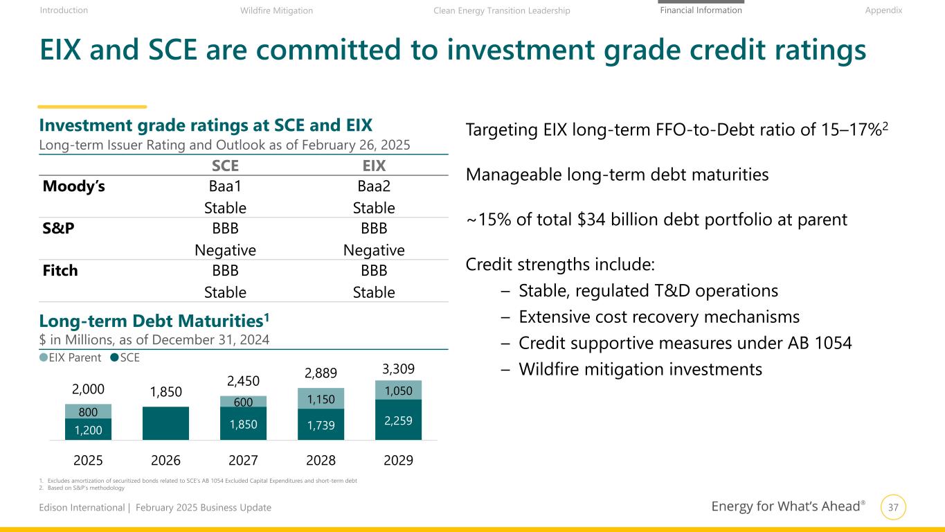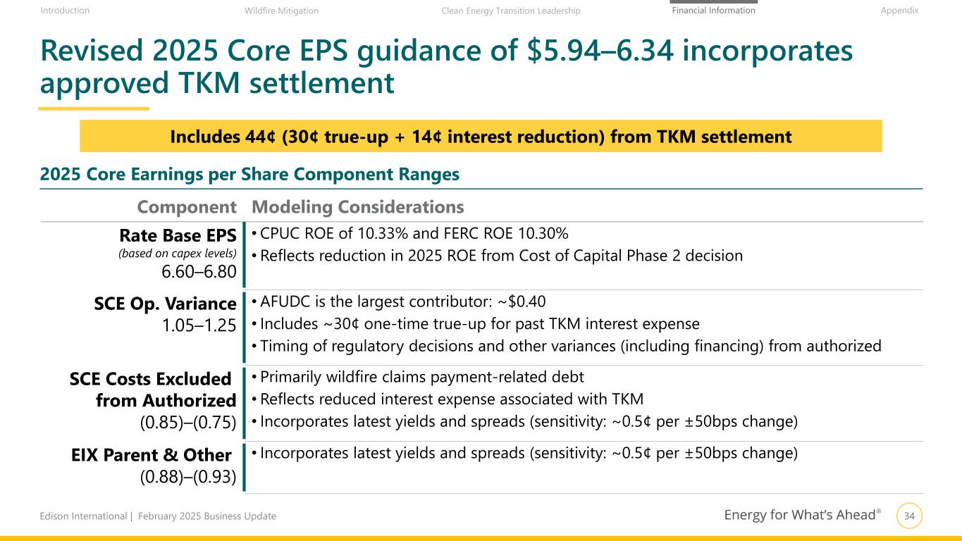 33Edison International | February 2025 Business Update Financial Information AppendixIntroduction Clean Energy Transition LeadershipWildfire Mitigation Cost recovery for 2017/2018 events benefits financial strength of the utility and reduces costs for customers Modeling sensitivities: For each $1 billion of cost recovery… Debt paydown with proceeds of securitization $1 billion Higher FFO-to-Debt ~40–50 bps Reduced interest expense ~$35 million (~9¢/share) Total potential avoided excess financing costs2 for SCE debt issued over next 10 years As high as $4.9 billion 1. Bill impact of $0.63/month for each $1 billion of recovery, with no impact to low-income customers. This will be offset by avoided excess financing costs for all customers 2. Based on analysis in the Thomas Fire and Debris Flow Cost Recovery Application – Financial Policy Testimony (SCE-01, Volume 3) Reduces overall costs to customers1