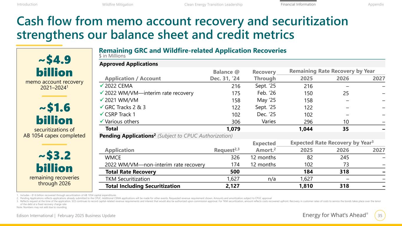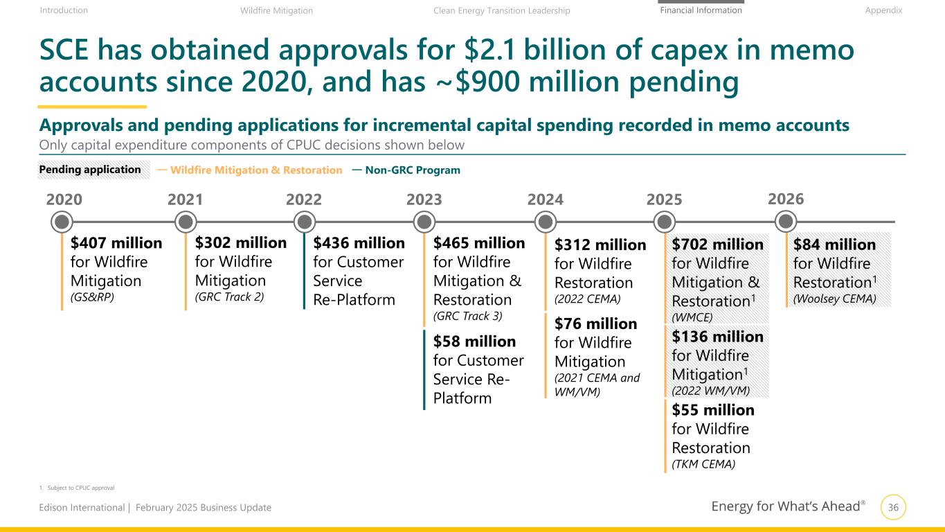 35Edison International | February 2025 Business Update Financial Information AppendixIntroduction Clean Energy Transition LeadershipWildfire Mitigation ~$4.9 billion memo account recovery 2021–20241 ~$1.6 billion securitizations of AB 1054 capex completed ~$3.2 billion remaining recoveries through 2026 Cash flow from memo account recovery and securitization strengthens our balance sheet and credit metrics Approved Applications Application / Account Balance @ Dec. 31, ’24 Recovery Through Remaining Rate Recovery by Year 2025 2026 2027  2022 CEMA 216 Sept. ’25 216 – –  2022 WM/VM—interim rate recovery 175 Feb. ‘26 150 25 –  2021 WM/VM 158 May ’25 158 – – GRC Tracks 2 & 3 122 Sept. ’25 122 – – CSRP Track 1 102 Dec. ’25 102 – – Various others 306 Varies 296 10 – Total 1,079 1,044 35 – Pending Applications2 (Subject to CPUC Authorization) Application Request2,3 Expected Amort.2 Expected Rate Recovery by Year3 2025 2026 2027 WMCE 326 12 months 82 245 – 2022 WM/VM—non-interim rate recovery 174 12 months 102 73 – Total Rate Recovery 500 184 318 – TKM Securitization 1,627 n/a 1,627 – – Total Including Securitization 2,127 1,810 318 – 1. Includes ~$1.6 billion recovered through securitization of AB 1054 capital expenditures 2. Pending Applications reflects applications already submitted to the CPUC. Additional CEMA applications will be made for other events. Requested revenue requirement shown. Amounts and amortization subject to CPUC approval 3. Reflects request at the time of the application. SCE continues to record capital-related revenue requirements and interest that would also be authorized upon commission approval. For TKM securitization, amount reflects costs recovered upfront. Recovery in customer rates of costs to service the bonds takes place over the tenor of the debt at a fixed recovery charge rate Note: Numbers may not add due to rounding Remaining GRC and Wildfire-related Application Recoveries $ in Millions
