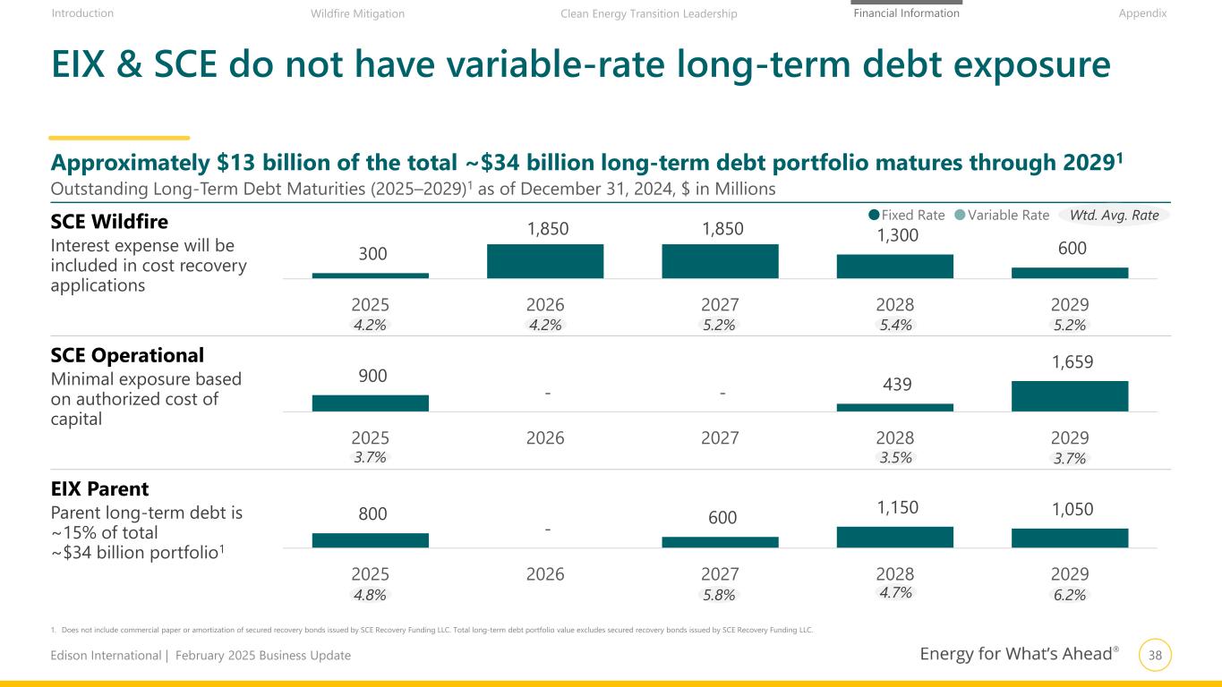 38Edison International | February 2025 Business Update Financial Information AppendixIntroduction Clean Energy Transition LeadershipWildfire Mitigation EIX & SCE do not have variable-rate long-term debt exposure Approximately $13 billion of the total ~$34 billion long-term debt portfolio matures through 20291 SCE Wildfire Interest expense will be included in cost recovery applications SCE Operational Minimal exposure based on authorized cost of capital EIX Parent Parent long-term debt is ~15% of total ~$34 billion portfolio1 Outstanding Long-Term Debt Maturities (2025–2029)1 as of December 31, 2024, $ in Millions 900 - - 439 1,659 2025 2026 2027 2028 2029 1. Does not include commercial paper or amortization of secured recovery bonds issued by SCE Recovery Funding LLC. Total long-term debt portfolio value excludes secured recovery bonds issued by SCE Recovery Funding LLC. 300 1,850 1,850 1,300 600 2025 2026 2027 2028 2029 800 - 600 1,150 1,050 2025 2026 2027 2028 2029 4.2% 5.2% 5.4% 3.7% 4.8% 5.8% Wtd. Avg. RateFixed Rate 4.2% Variable Rate 6.2% 3.7%3.5% 4.7% 5.2%