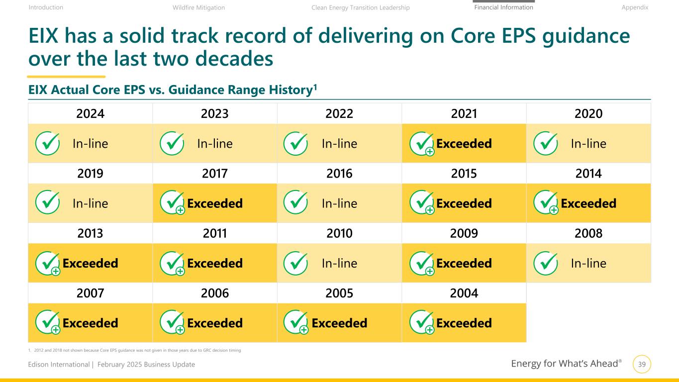 39Edison International | February 2025 Business Update Financial Information AppendixIntroduction Clean Energy Transition LeadershipWildfire Mitigation EIX has a solid track record of delivering on Core EPS guidance over the last two decades 2024 2023 2022 2021 2020 In-line In-line In-line Exceeded In-line 2019 2017 2016 2015 2014 In-line Exceeded In-line Exceeded Exceeded 2013 2011 2010 2009 2008 Exceeded Exceeded In-line Exceeded In-line 2007 2006 2005 2004 Exceeded Exceeded Exceeded Exceeded EIX Actual Core EPS vs. Guidance Range History1    1. 2012 and 2018 not shown because Core EPS guidance was not given in those years due to GRC decision timing   + +  +++  + + + + + +