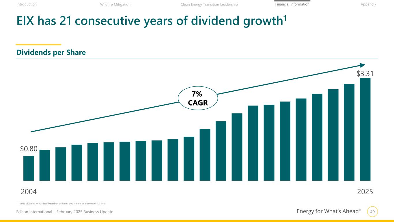 40Edison International | February 2025 Business Update Financial Information AppendixIntroduction Clean Energy Transition LeadershipWildfire Mitigation EIX has 21 consecutive years of dividend growth1 $0.80 $3.31 2004 2025 7% CAGR Dividends per Share 1. 2025 dividend annualized based on dividend declaration on December 12, 2024