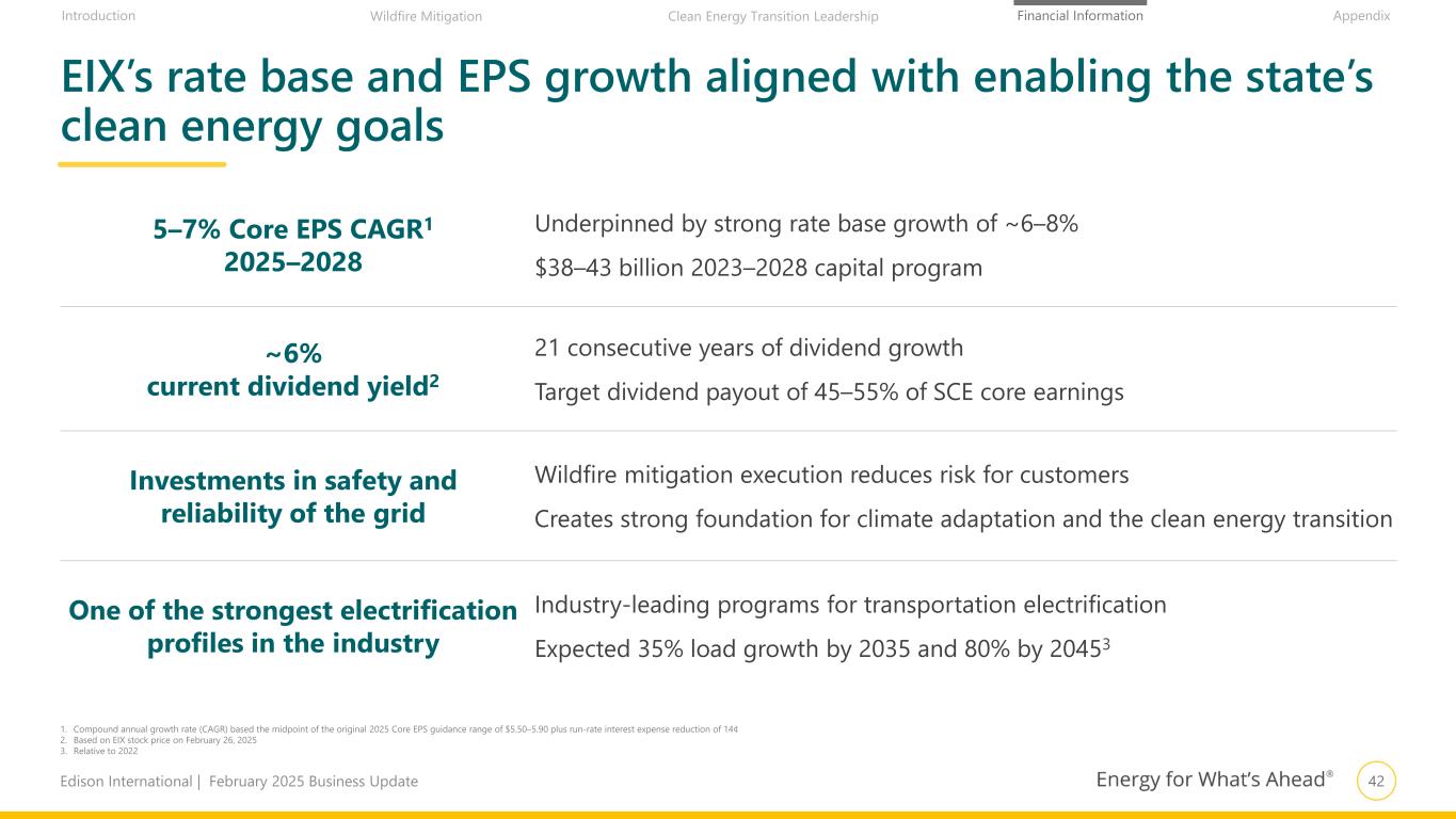 41Edison International | February 2025 Business Update Financial Information AppendixIntroduction Clean Energy Transition LeadershipWildfire Mitigation EIX expects 5–7% Core EPS growth for 2025–2028, with financing plan showing minimal equity needs 1. For 2025, represents the midpoint of the original 2025 Core EPS guidance range for $5.50–5.90 plus run-rate interest expense reduction of 14¢ and one-time true up for past interest expense of 30¢ 2. Financing plan is subject to change. Does not incorporate TKM settlement agreement or potential cost recovery in the Woolsey cost recovery proceeding, which could materially change the financing plan 3. EIX Dividends includes common and preferred dividends, which are subject to approval by the EIX Board of Directors 4. Incremental to refinancing of maturities. Values shown include both SCE and parent debt $5.84 $6.14 $6.74–7.14 2025 Midpoint 2028 Achievable EPS growth for 2028 Core Earnings per Share Guidance1 5–7% CAGR Uses Sources 2025–2028 EIX consolidated financing plan2 $ in Billions Capital Plan $27–32 Dividends3 $6–7 Net cash provided by operating activities $25–28 Incremental Debt4 $8–11 Equity ~$0.4 (excluding one-time TKM settlement true-up) (Includes 14¢ interest expense impact from TKM settlement)