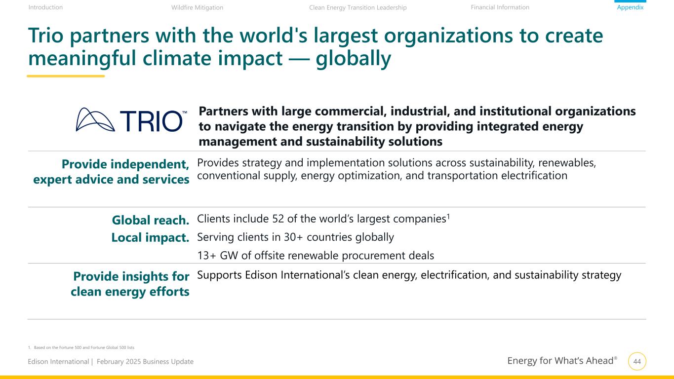 44Edison International | February 2025 Business Update AppendixIntroduction Financial InformationClean Energy Transition LeadershipWildfire Mitigation Partners with large commercial, industrial, and institutional organizations to navigate the energy transition by providing integrated energy management and sustainability solutions Provide independent, expert advice and services Provides strategy and implementation solutions across sustainability, renewables, conventional supply, energy optimization, and transportation electrification Global reach. Local impact. Clients include 52 of the world’s largest companies1 Serving clients in 30+ countries globally 13+ GW of offsite renewable procurement deals Provide insights for clean energy efforts Supports Edison International’s clean energy, electrification, and sustainability strategy Trio partners with the world's largest organizations to create meaningful climate impact — globally 1. Based on the Fortune 500 and Fortune Global 500 lists