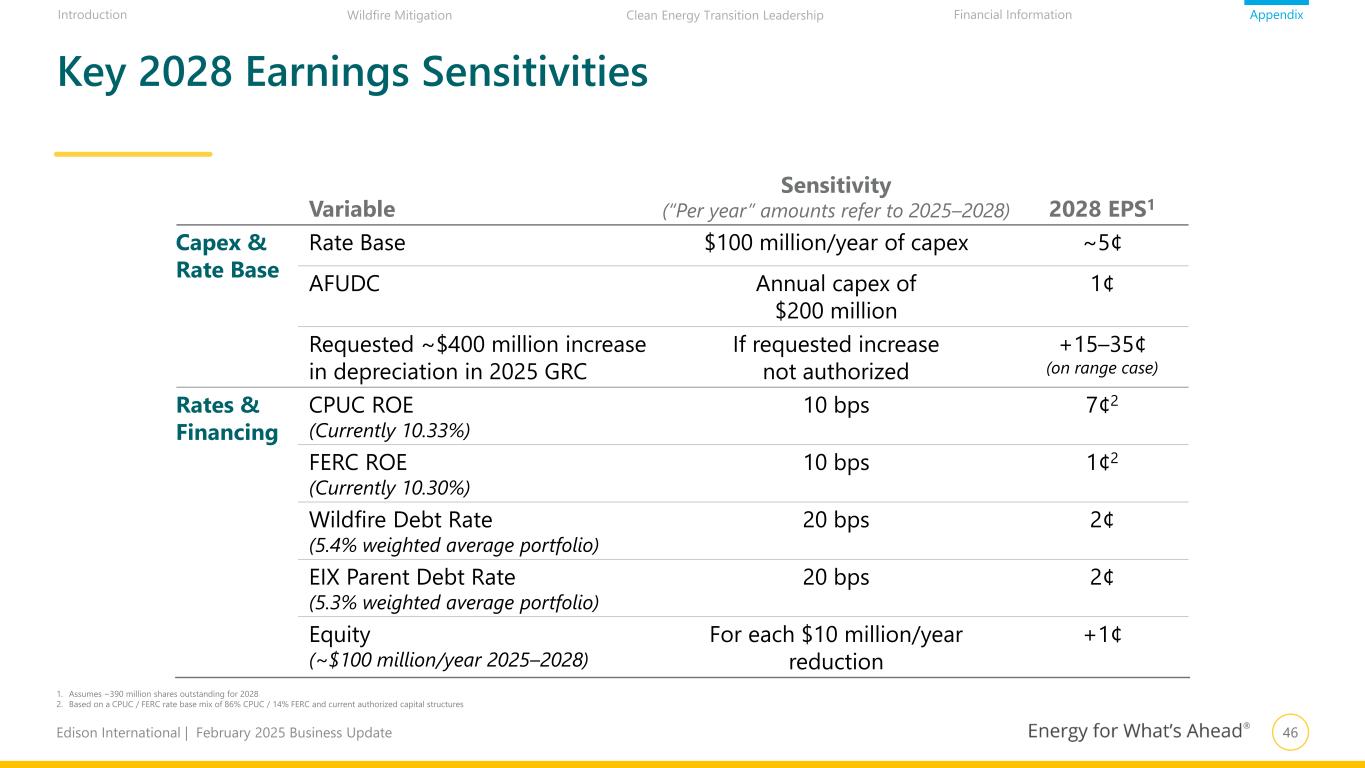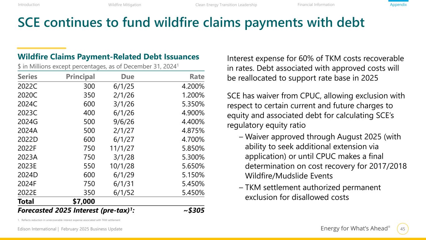 45Edison International | February 2025 Business Update AppendixIntroduction Financial InformationClean Energy Transition LeadershipWildfire Mitigation SCE continues to fund wildfire claims payments with debt Series Principal Due Rate 2022C 300 6/1/25 4.200% 2020C 350 2/1/26 1.200% 2024C 600 3/1/26 5.350% 2023C 400 6/1/26 4.900% 2024G 500 9/6/26 4.400% 2024A 500 2/1/27 4.875% 2022D 600 6/1/27 4.700% 2022F 750 11/1/27 5.850% 2023A 750 3/1/28 5.300% 2023E 550 10/1/28 5.650% 2024D 600 6/1/29 5.150% 2024F 750 6/1/31 5.450% 2022E 350 6/1/52 5.450% Total $7,000 Forecasted 2025 Interest (pre-tax)1: ~$305 Wildfire Claims Payment-Related Debt Issuances $ in Millions except percentages, as of December 31, 20241 Interest expense for 60% of TKM costs recoverable in rates. Debt associated with approved costs will be reallocated to support rate base in 2025 SCE has waiver from CPUC, allowing exclusion with respect to certain current and future charges to equity and associated debt for calculating SCE’s regulatory equity ratio – Waiver approved through August 2025 (with ability to seek additional extension via application) or until CPUC makes a final determination on cost recovery for 2017/2018 Wildfire/Mudslide Events – TKM settlement authorized permanent exclusion for disallowed costs 1. Reflects reduction in unrecoverable interest expense associated with TKM settlement