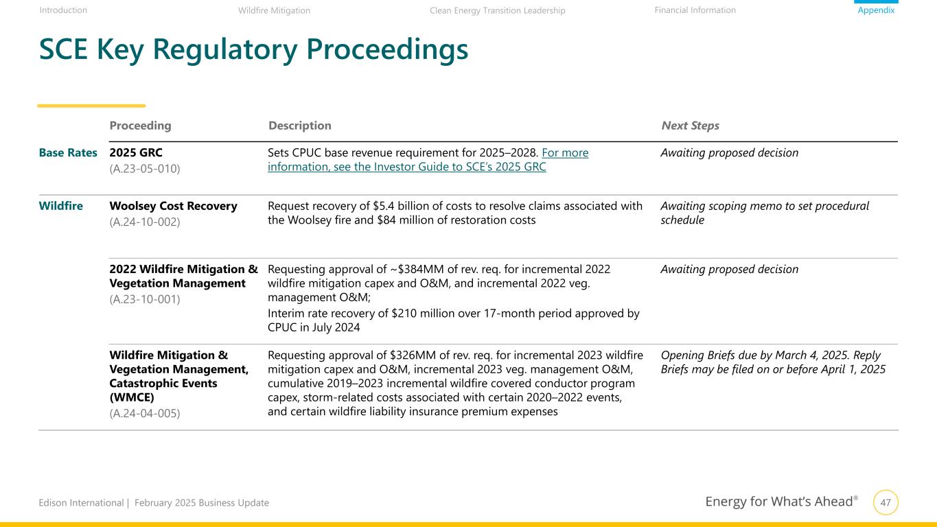 47Edison International | February 2025 Business Update AppendixIntroduction Financial InformationClean Energy Transition LeadershipWildfire Mitigation SCE Key Regulatory Proceedings Proceeding Description Next Steps Base Rates 2025 GRC (A.23-05-010) Sets CPUC base revenue requirement for 2025–2028. For more information, see the Investor Guide to SCE’s 2025 GRC Awaiting proposed decision Wildfire Woolsey Cost Recovery (A.24-10-002) Request recovery of $5.4 billion of costs to resolve claims associated with the Woolsey fire and $84 million of restoration costs Awaiting scoping memo to set procedural schedule 2022 Wildfire Mitigation & Vegetation Management (A.23-10-001) Requesting approval of ~$384MM of rev. req. for incremental 2022 wildfire mitigation capex and O&M, and incremental 2022 veg. management O&M; Interim rate recovery of $210 million over 17-month period approved by CPUC in July 2024 Awaiting proposed decision Wildfire Mitigation & Vegetation Management, Catastrophic Events (WMCE) (A.24-04-005) Requesting approval of $326MM of rev. req. for incremental 2023 wildfire mitigation capex and O&M, incremental 2023 veg. management O&M, cumulative 2019–2023 incremental wildfire covered conductor program capex, storm-related costs associated with certain 2020–2022 events, and certain wildfire liability insurance premium expenses Opening Briefs due by March 4, 2025. Reply Briefs may be filed on or before April 1, 2025