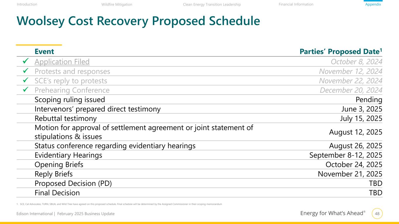 48Edison International | February 2025 Business Update AppendixIntroduction Financial InformationClean Energy Transition LeadershipWildfire Mitigation Woolsey Cost Recovery Proposed Schedule Event Parties’ Proposed Date1  Application Filed October 8, 2024  Protests and responses November 12, 2024  SCE’s reply to protests November 22, 2024  Prehearing Conference December 20, 2024 Scoping ruling issued Pending Intervenors’ prepared direct testimony June 3, 2025 Rebuttal testimony July 15, 2025 Motion for approval of settlement agreement or joint statement of stipulations & issues August 12, 2025 Status conference regarding evidentiary hearings August 26, 2025 Evidentiary Hearings September 8-12, 2025 Opening Briefs October 24, 2025 Reply Briefs November 21, 2025 Proposed Decision (PD) TBD Final Decision TBD 1. SCE, Cal Advocates, TURN, SBUA, and Wild Tree have agreed on this proposed schedule. Final schedule will be determined by the Assigned Commissioner in their scoping memorandum